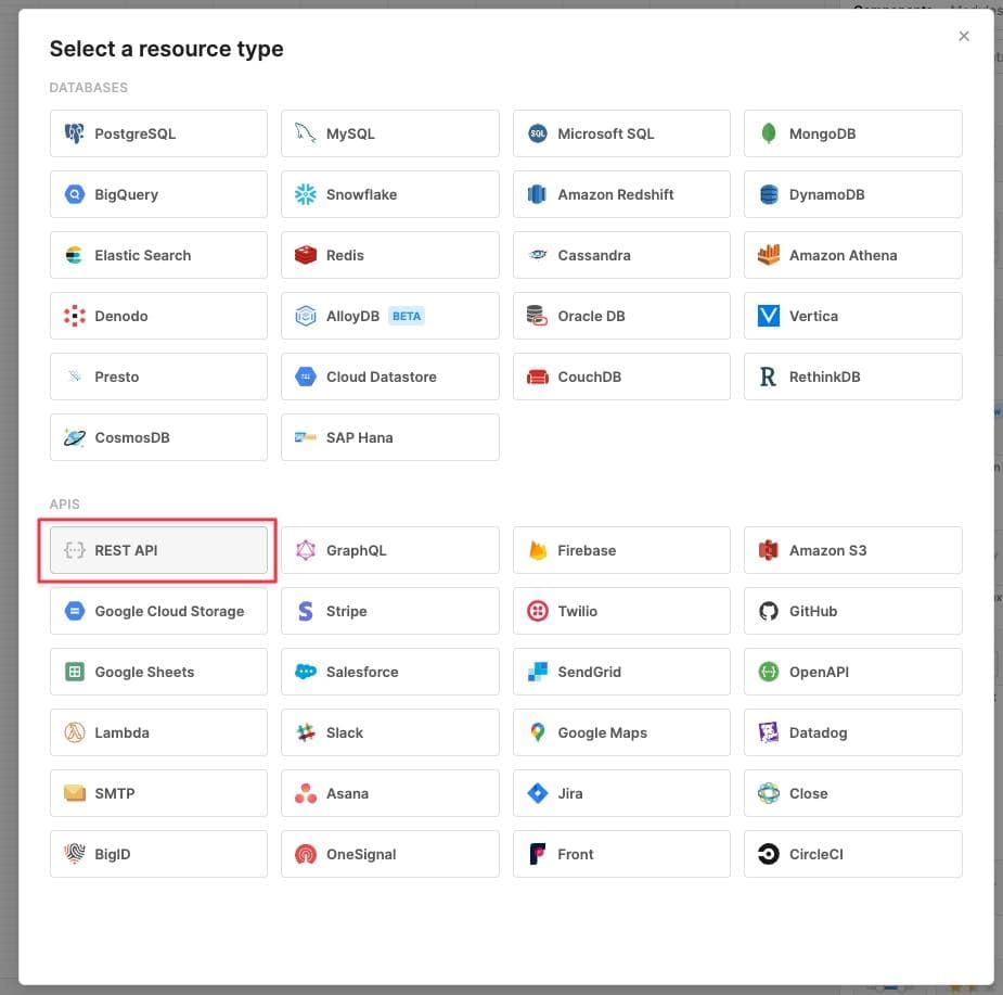 Login to Retool, and then click on Resources in the top menu bar. Then click on Create new -> Resource -> REST API