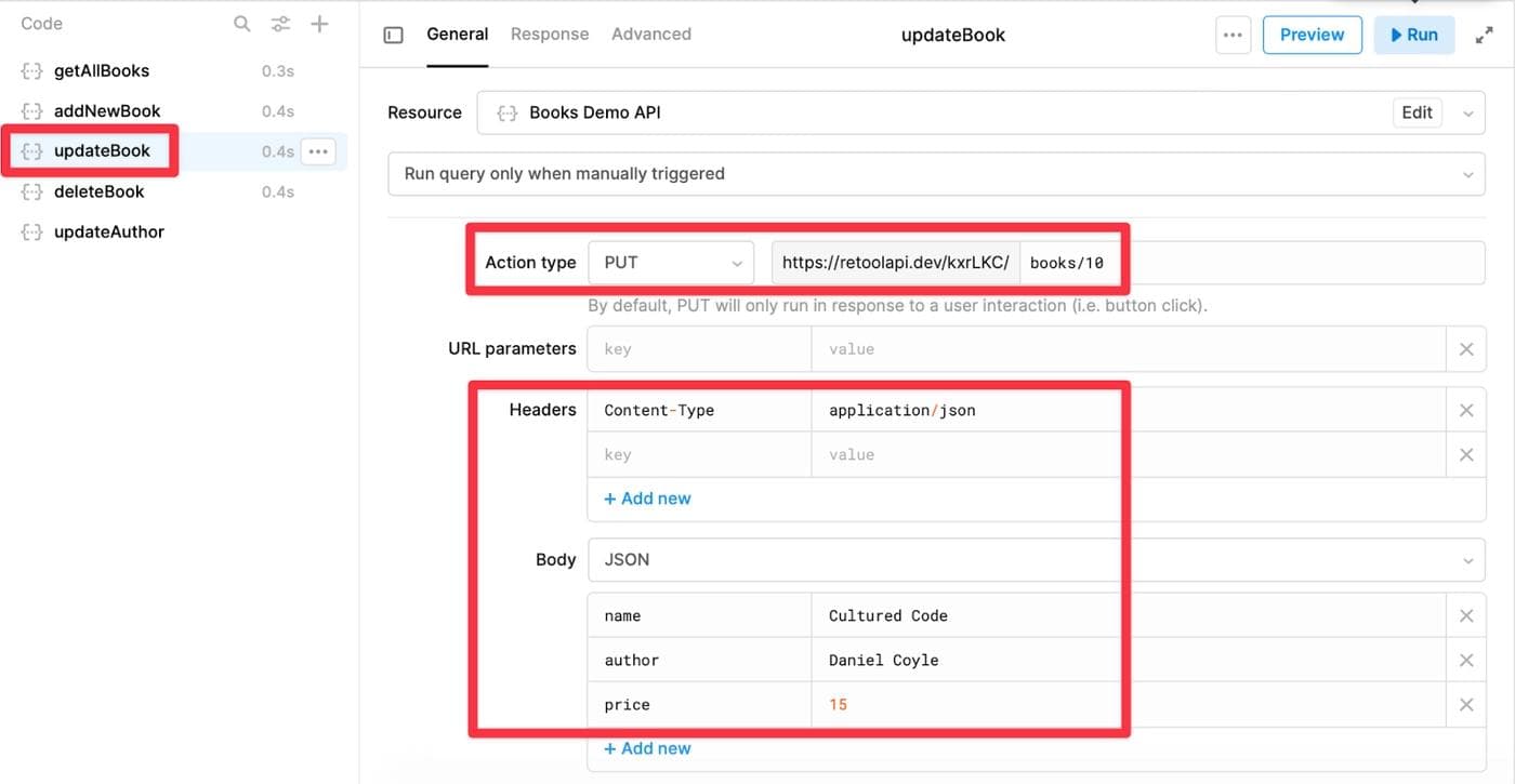 We will use the PUT method to update the book information identified by "id”, and update the price for the book we just added. On the bottom panel, select the query updateBook, and then click on Run to test the query.