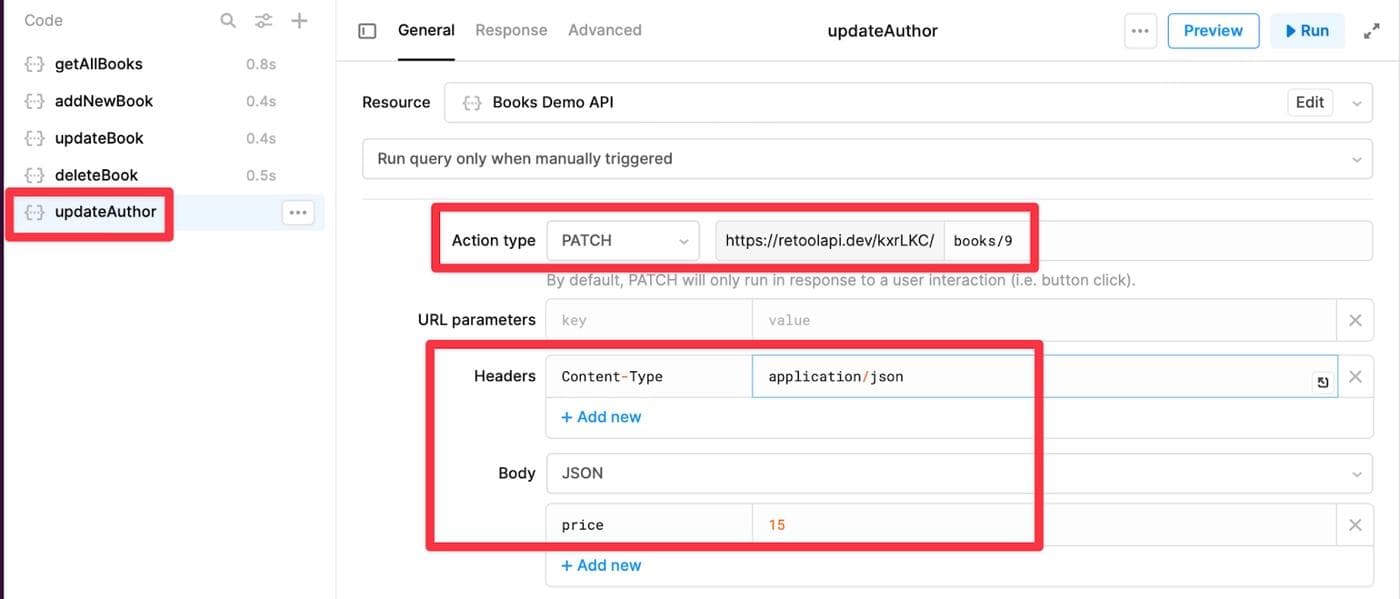 We will use the PATCH request to update the price of a book. On the bottom panel, select the query updateAuthor, and then click on Run to test the query. You should see a success response, along with a JSON response confirming that the record was deleted.