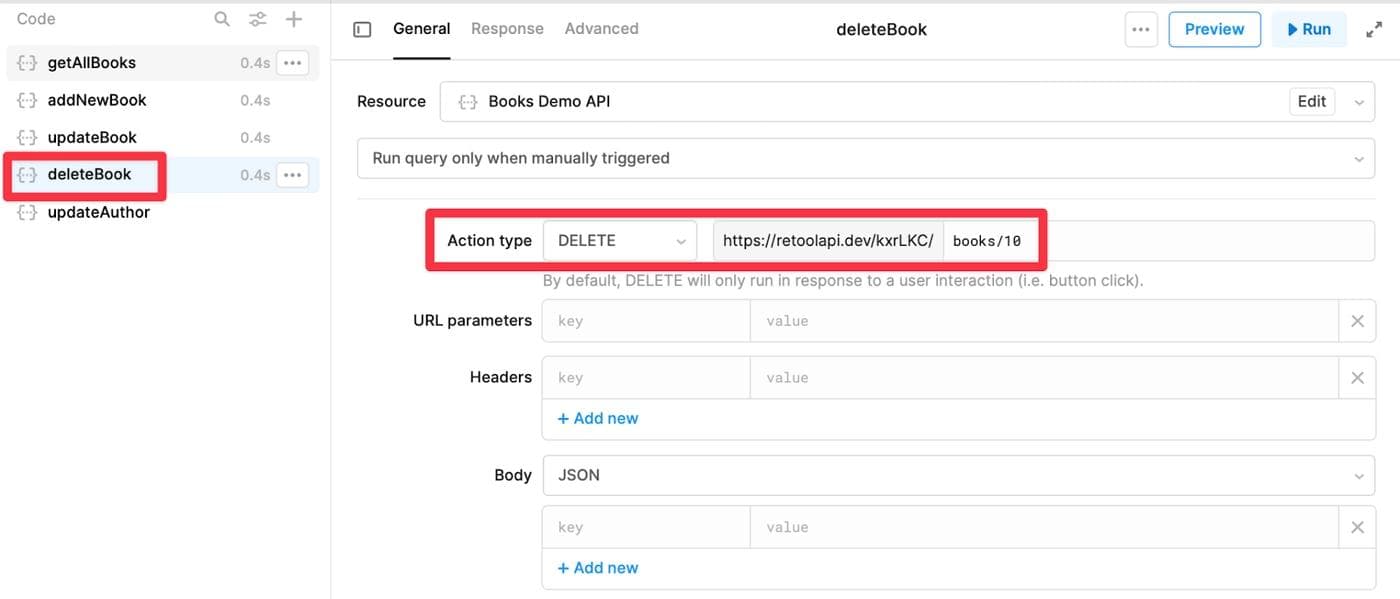 We will use the DELETE method to delete a book identified by "id", and delete the book we just added. On the bottom panel, select the query deleteBook, and then click on Run to test the query. You should see a success response, along with a JSON response confirming that the record was deleted.