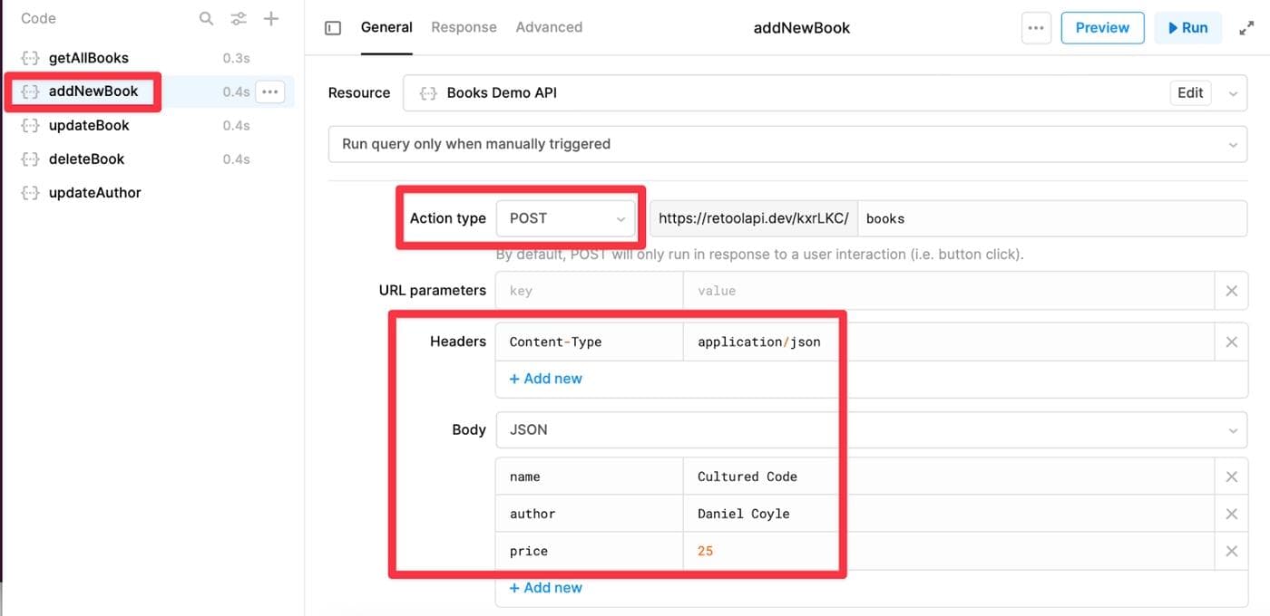 We will use the POST method to create a new book record. On the bottom panel, select the query addNewBook, and then click on Run to test the query.