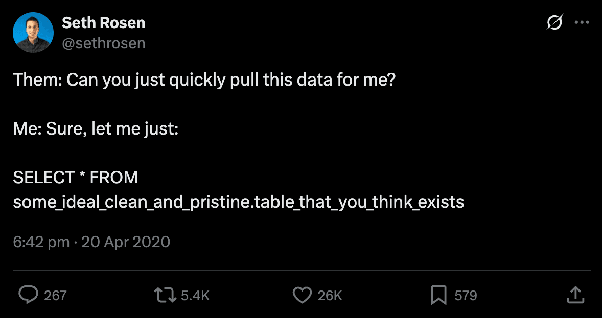 Imagine you have a CFO who knows bare-minimum SQL—enough to say, "select column A from table B where X equals Y." You have everything in place so that you can trust that this CFO can access your data warehouse, consult the documentation available, fetch their own data, and generate their own insights.