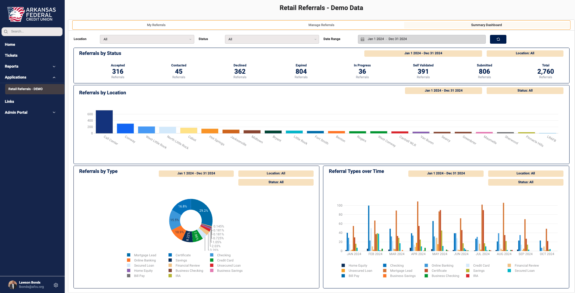 In just two weeks, Lawson and his team developed an app analysts can use to manage customer referrals and view referral reports. This application now serves over 200 employees daily, where both client-facing employees and analysts can log in, create and manage customer referrals to financial products, and view a summary dashboard that visualizes referral statistics by status, location, type, and time. Client-facing employees could create and track the status of their referrals, and analysts could run reports and view analytics on those referrals.