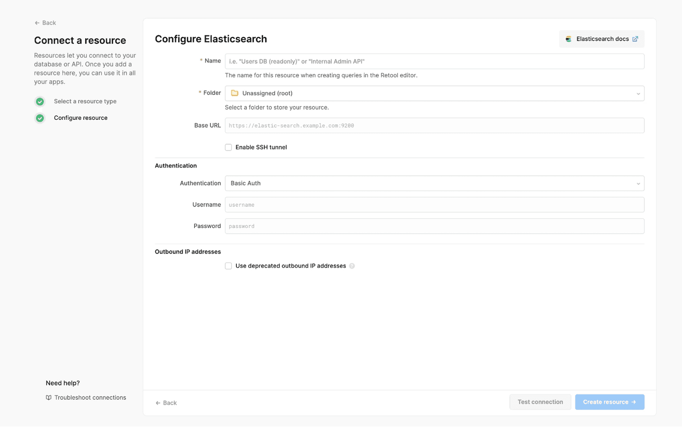 Sign into Retool, and head to the Resources tab. Click Create new, then select Resource. Select the Elasticsearch resource type.