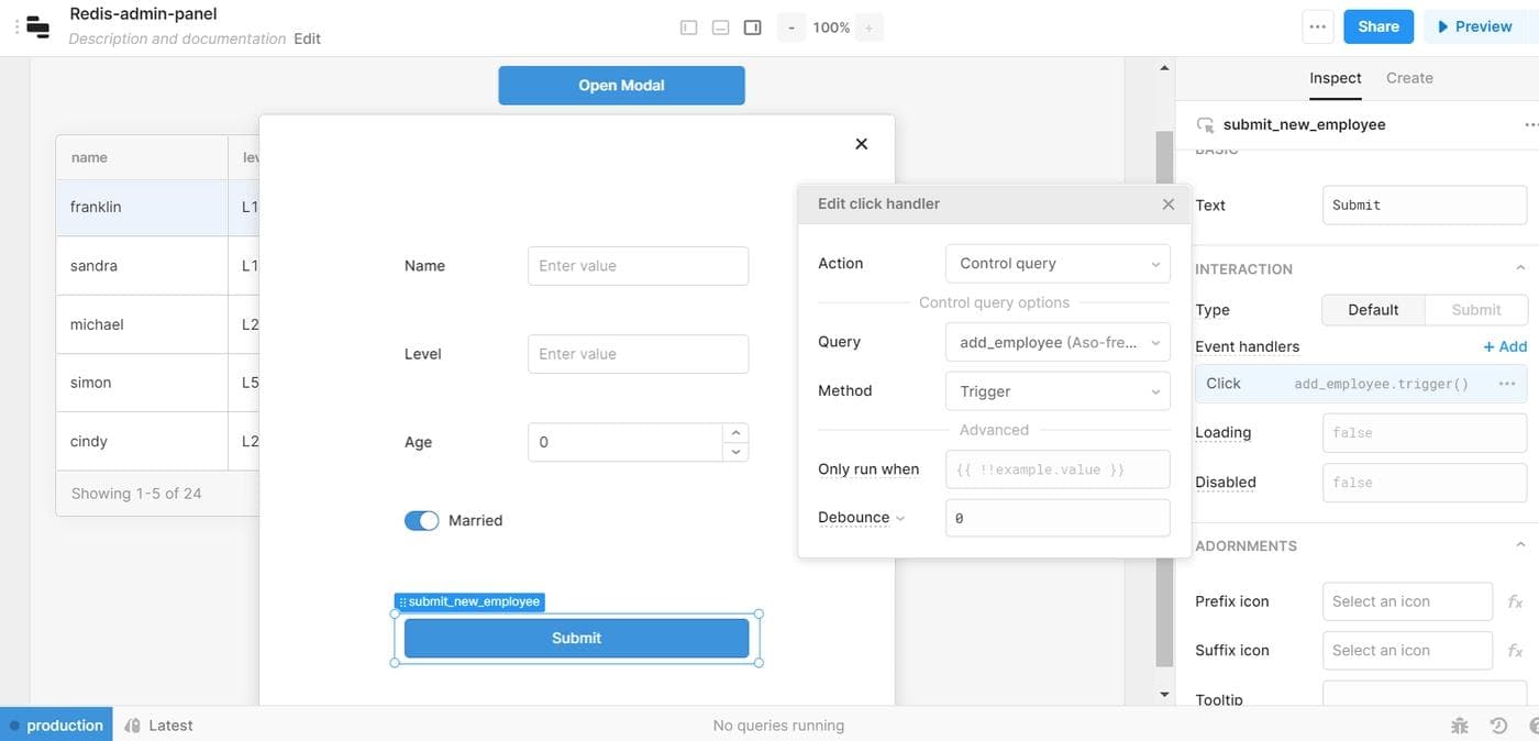 Using the right panel, we insert a blank modal. Via the Inspect tab, we change the name of the modal from modal1 to create_employee_modal and the button text to Add New Employee.