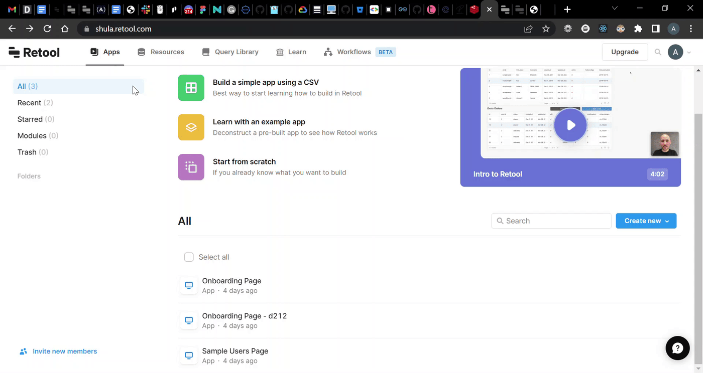 Note that if you just created your Retool account, you'll be redirected to the app editor and the name of the app will default to Onboarding Page.