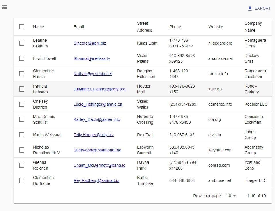 1 2 3 4 5 6 7 8 9 10 11 12 13 14 15 16 17import React from 'react'; import { List, Datagrid, TextField, EmailField } from 'react-admin'; export const UserList = props => ( <List {...props}> <Datagrid rowClick="edit"> <TextField source="id" /> <TextField source="name" /> <TextField source="username" /> <EmailField source="email" /> <TextField source="address.street" /> <TextField source="phone" /> <TextField source="website" /> <TextField source="company.name" /> </Datagrid> </List> );