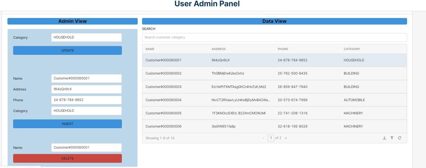 Here's a sample admin panel app with features like search, insert, update, and delete.