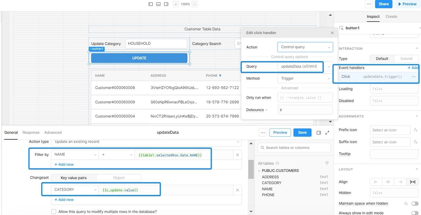 As a final step, edit the Update button to add an event handler as updateData.trigger() to trigger the update query when the user clicks this button.