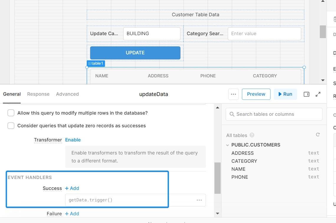 If you want to add an auto-refresh feature after the update operation, you can add an Event Handler for Success in the "updateData" resource query. In Event Handler, add Control Query as an action to trigger the already created "getData" query. This will fetch the records from table after the update action and show the updated records in table view.