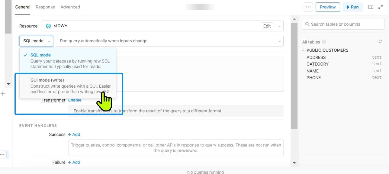 To create the update query, create a new "Resource Query" similar to the "getData" query created earlier. However, use the GUI mode for any DML operations like insert/update/delete.