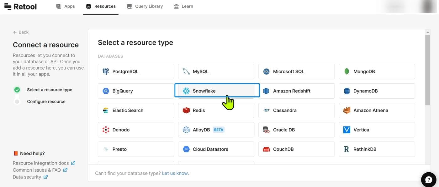 Retool has a native Snowflake connector. To establish this connection, you must first create a resource in Retool. To do this, log into your Retool account, and in the top menu bar, click on the Resources tab, then Create New, and then Resource.