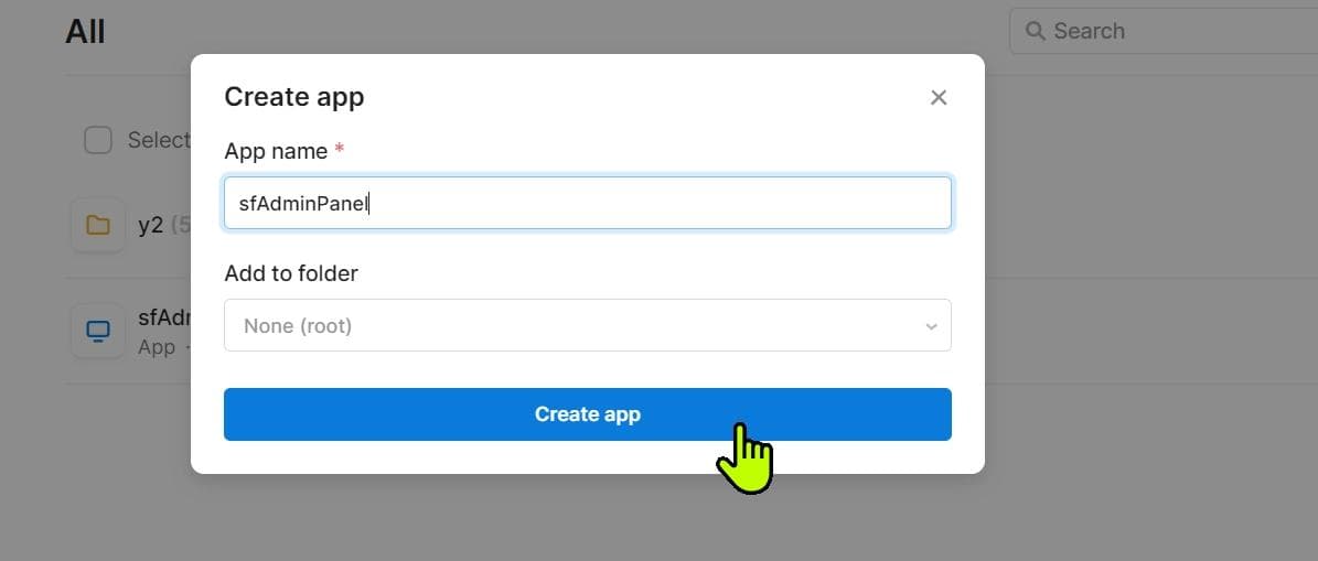 Provide a meaningful name like "sfAdminPanel" and create the app.