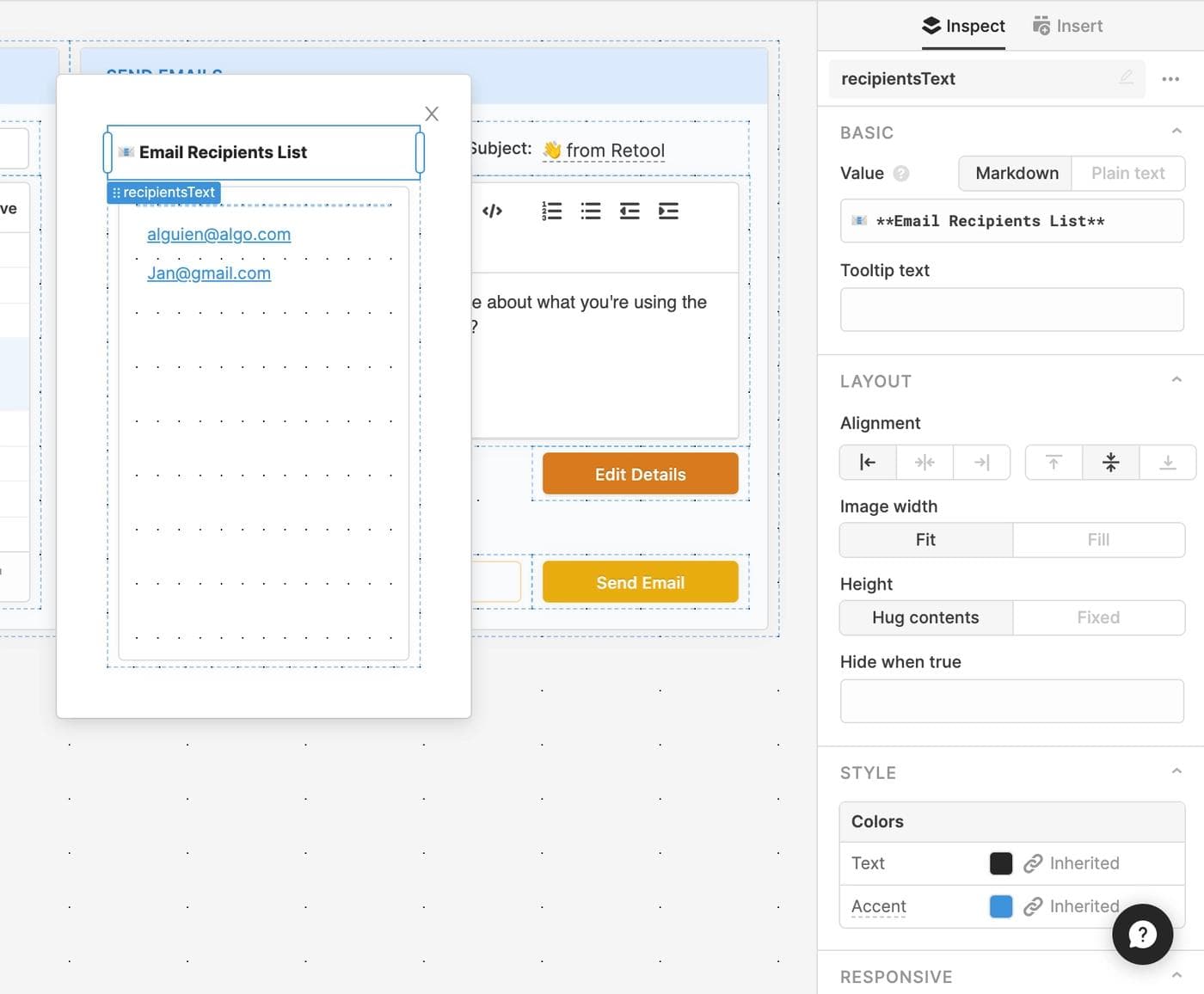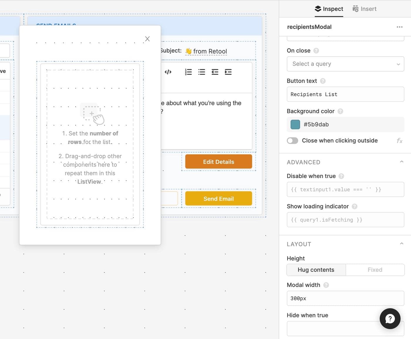 Start by dragging another modal component onto the canvas. Inside of this one, we’re going to add a listview component – it lets us create an arbitrarily long repeating list of components. In our case, it’s going to be a list of all of the emails we’ve selected from the table.