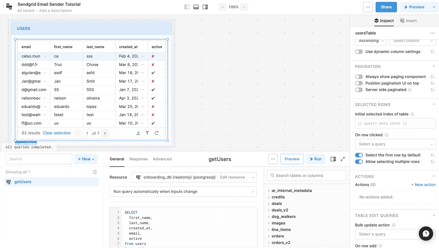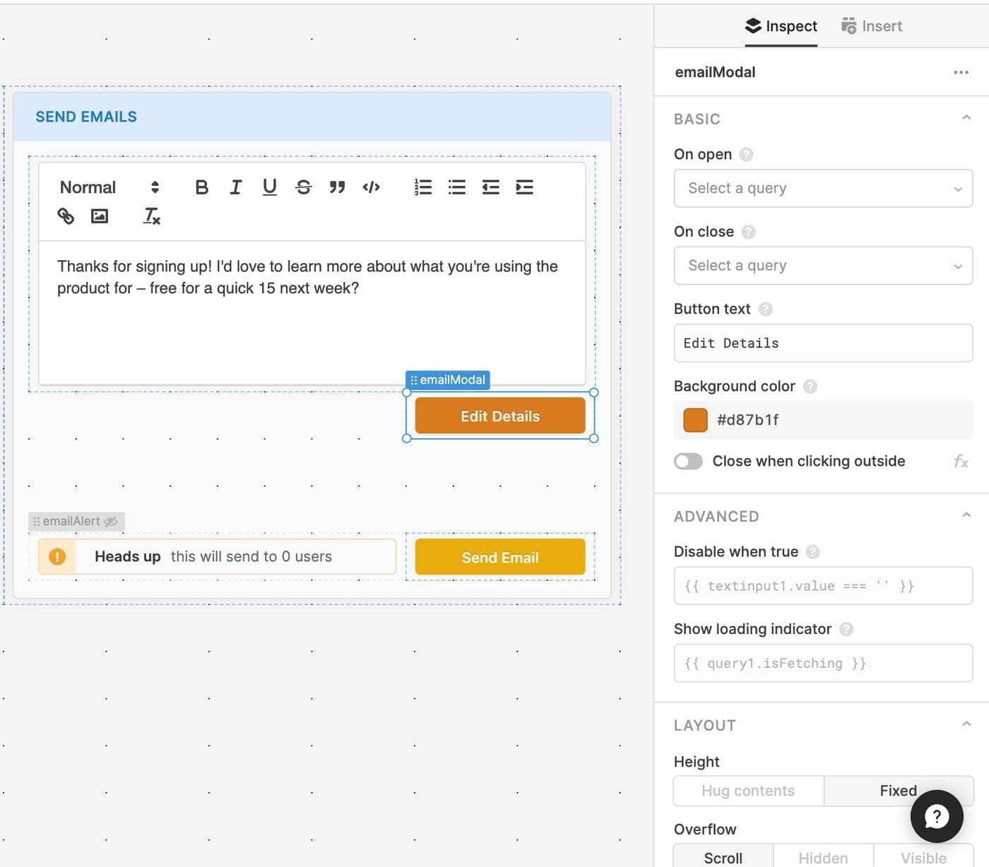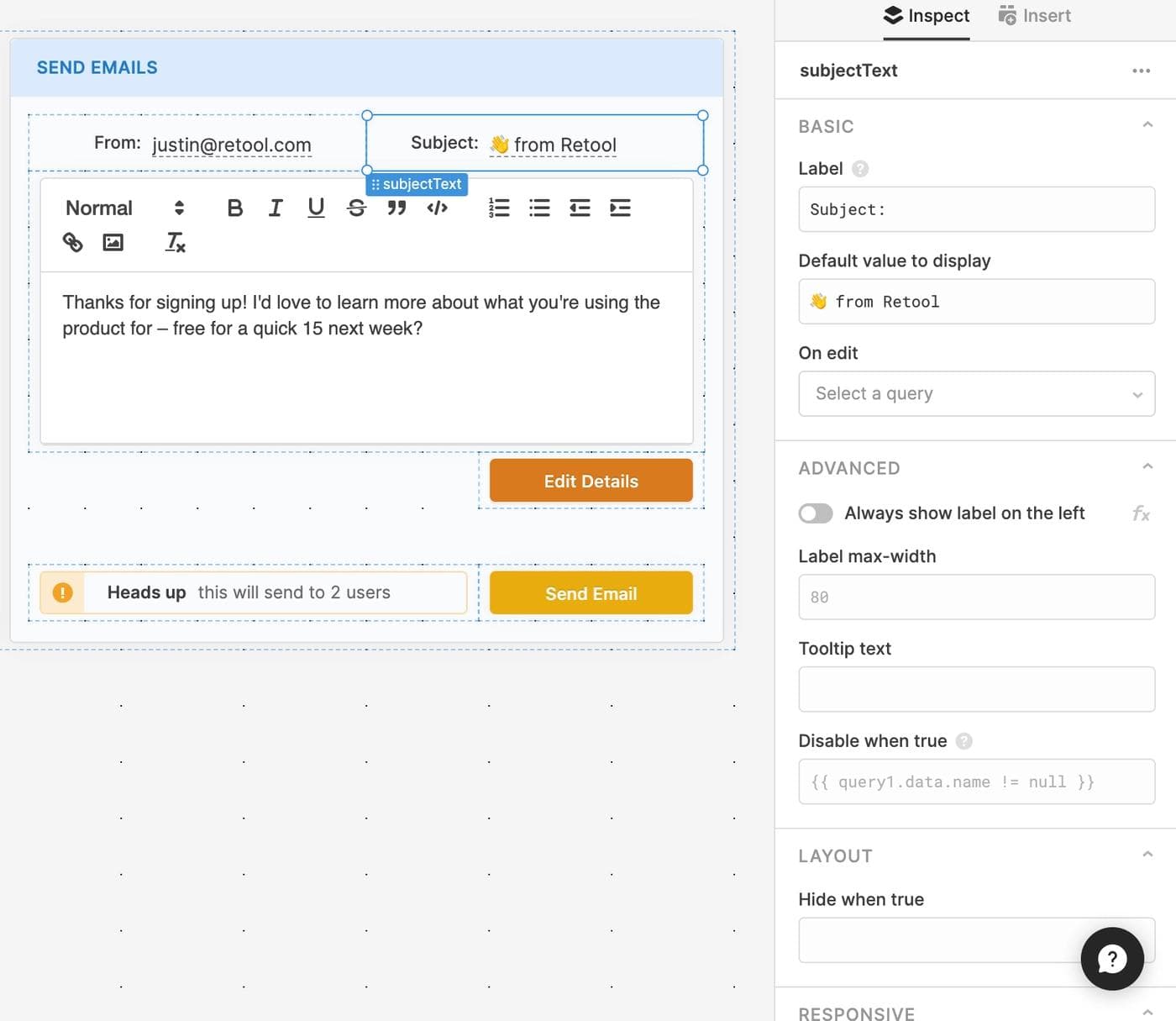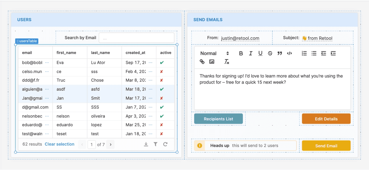 On the left, we’re pulling a list of users from a Postgres DB. On the right, we’ve got a rich text editor for writing your emails, a modal to edit email details, another modal for viewing selected recipients, and a big ol’ button to send emails out to the users selected in the table.