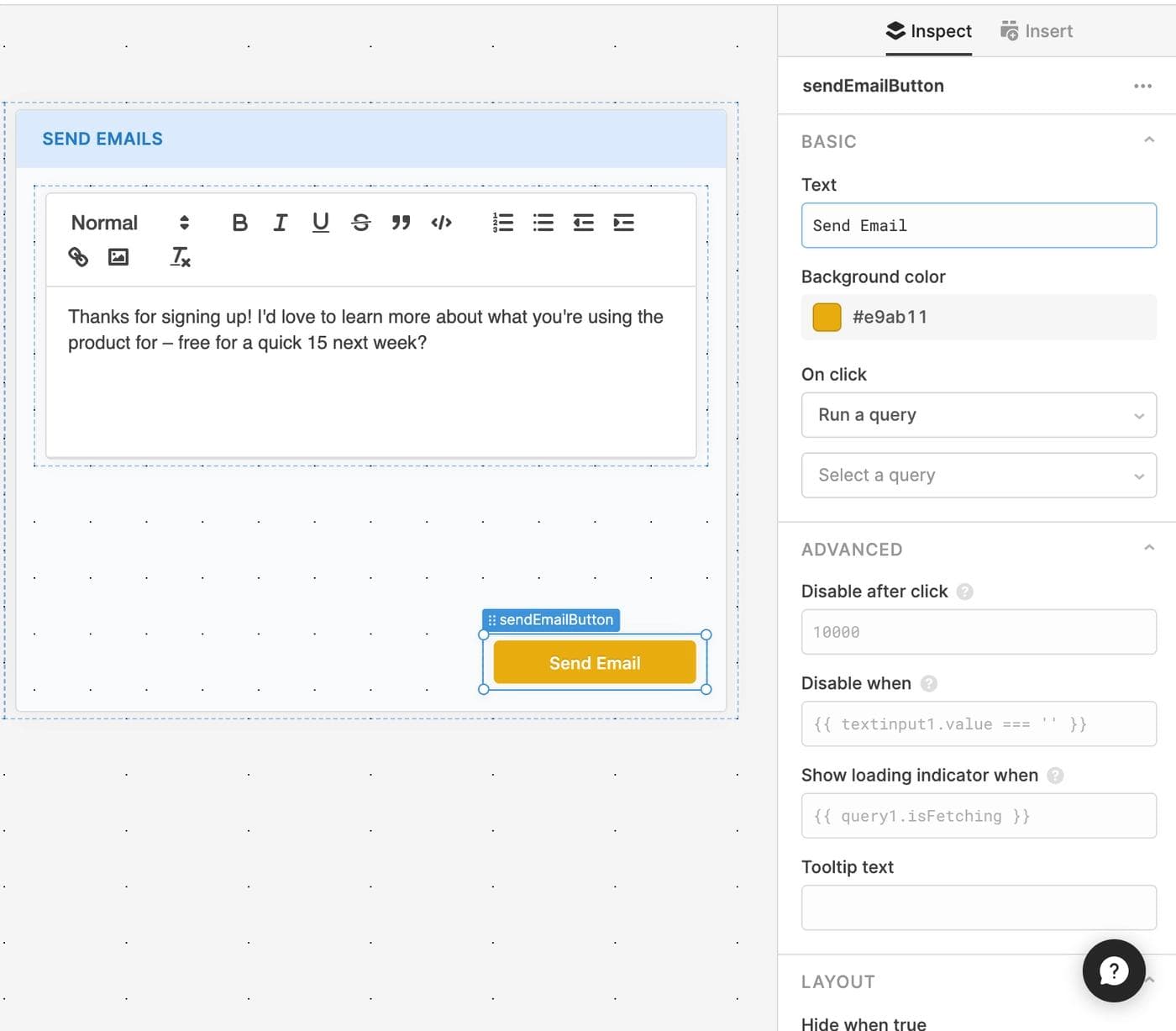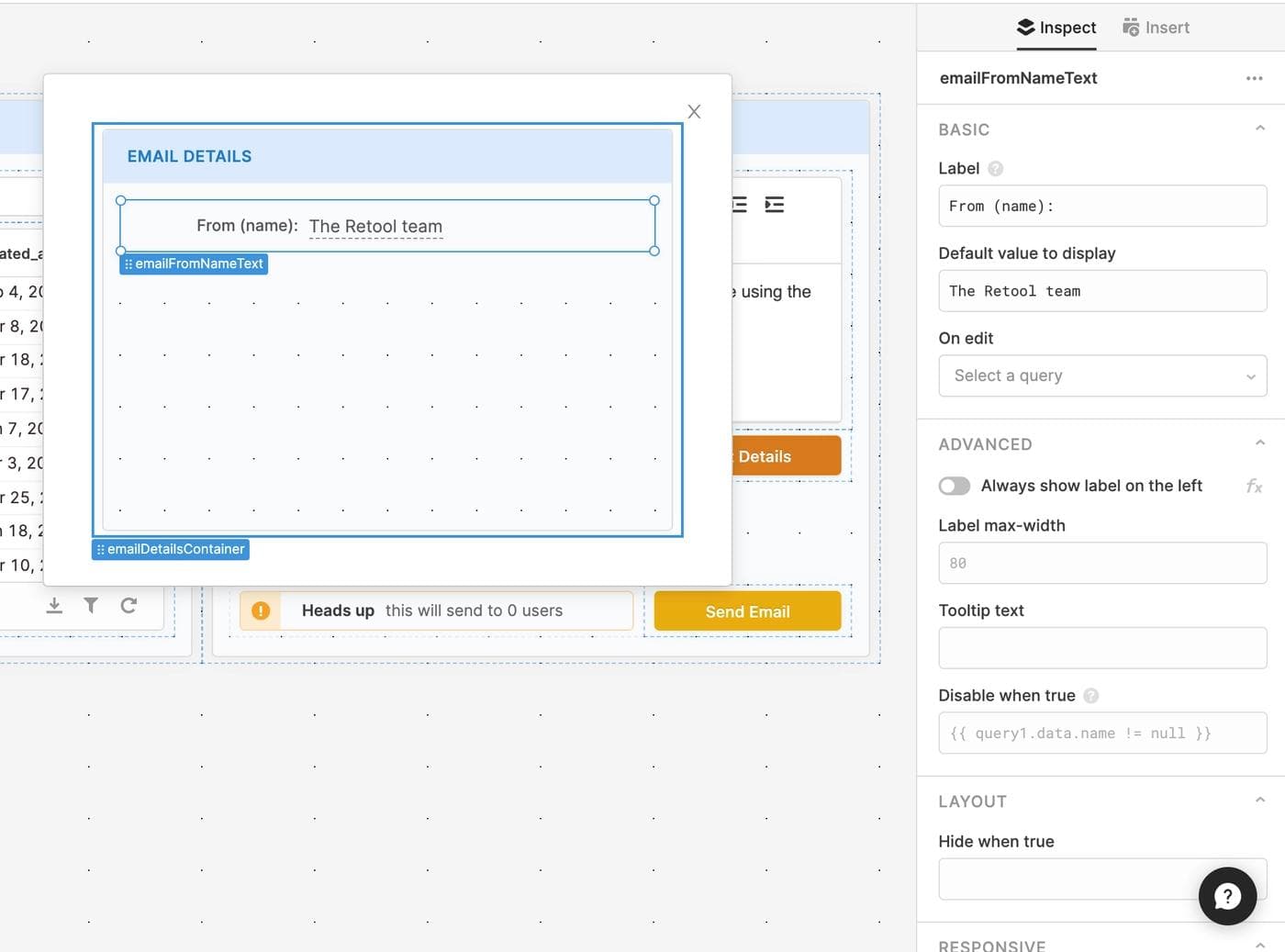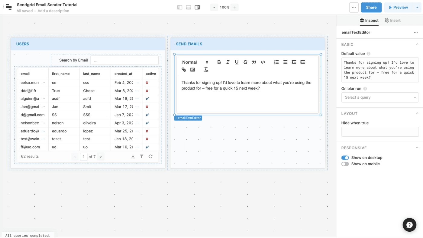 On the left, we’re pulling a list of users from a Postgres DB. On the right, we’ve got a rich text editor for writing your emails, a modal to edit email details, another modal for viewing selected recipients, and a big ol’ button to send emails out to the users selected in the table.
