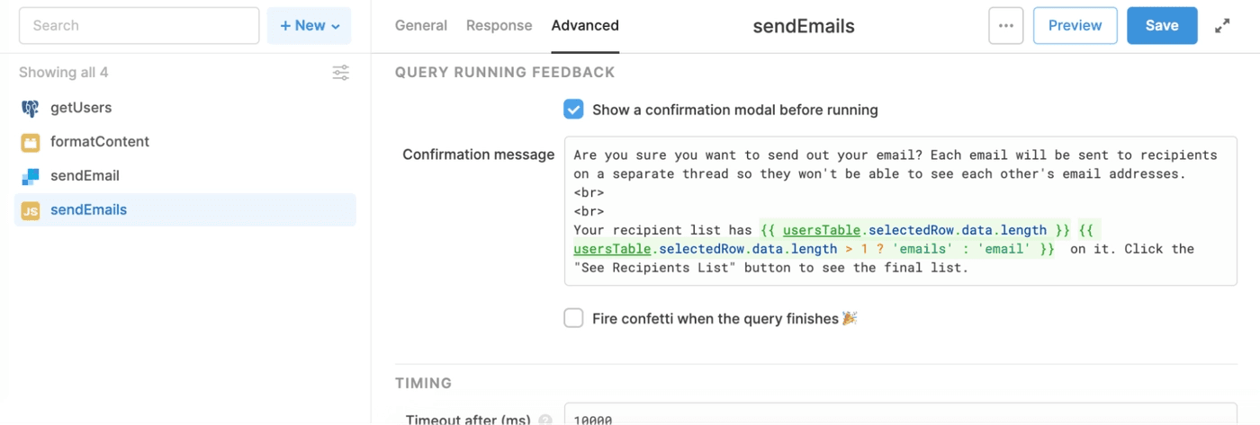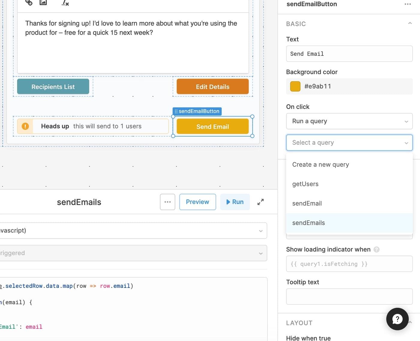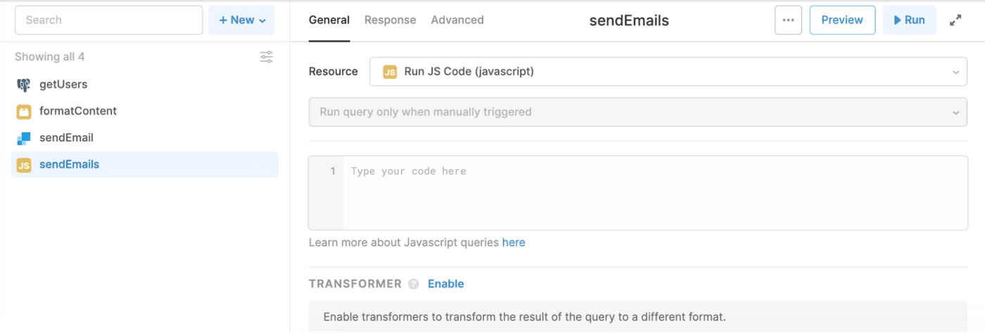 Last step: we’ll create a JavaScript query that iterates through each selected email address and runs the above SendGrid query for each. Click “New” and create a JavaScript query. We’ll call this one sendEmails.