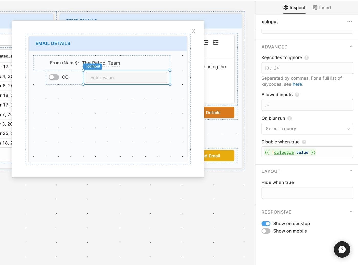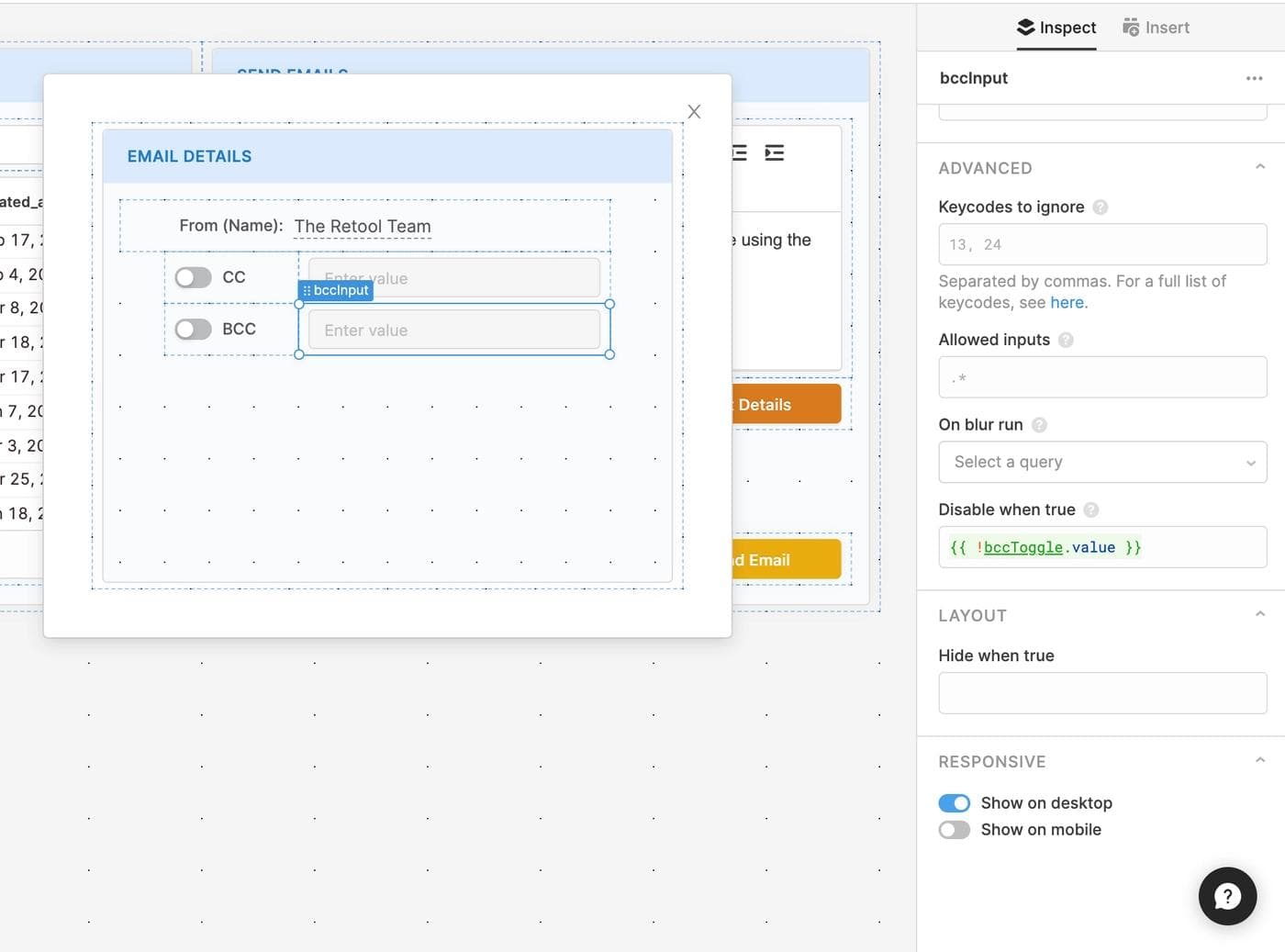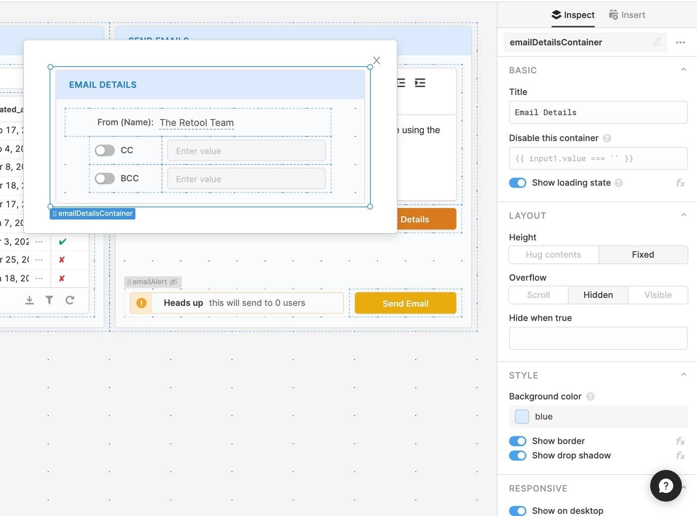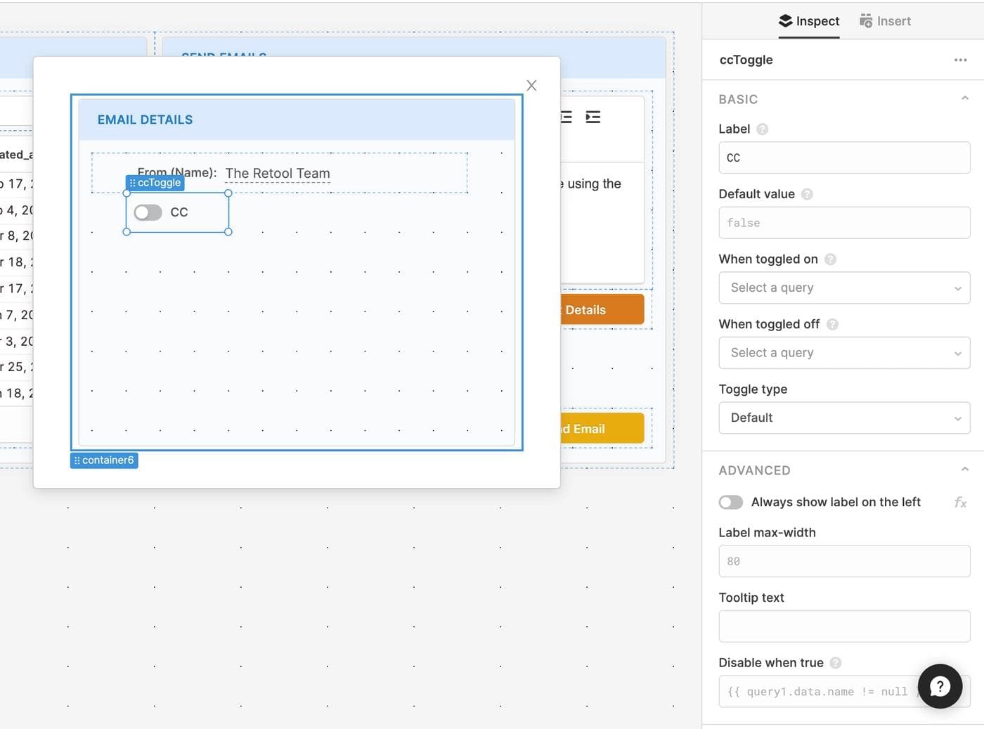 We want our users to be able to edit email details, like CCs and BCCs. Let’s drag a modal component into the email container:
