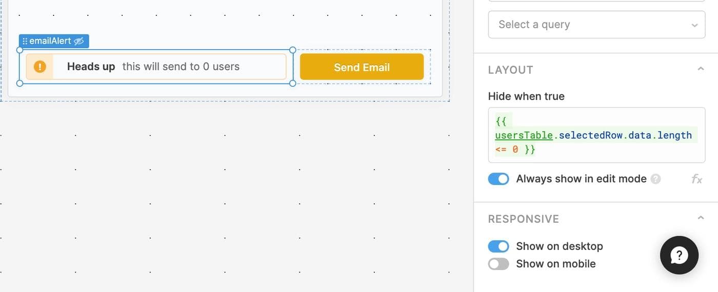 We definitely don’t want to alert our users if 0 rows are selected – as no emails will be sent – so let’s conditionally hide this alert component in that case: