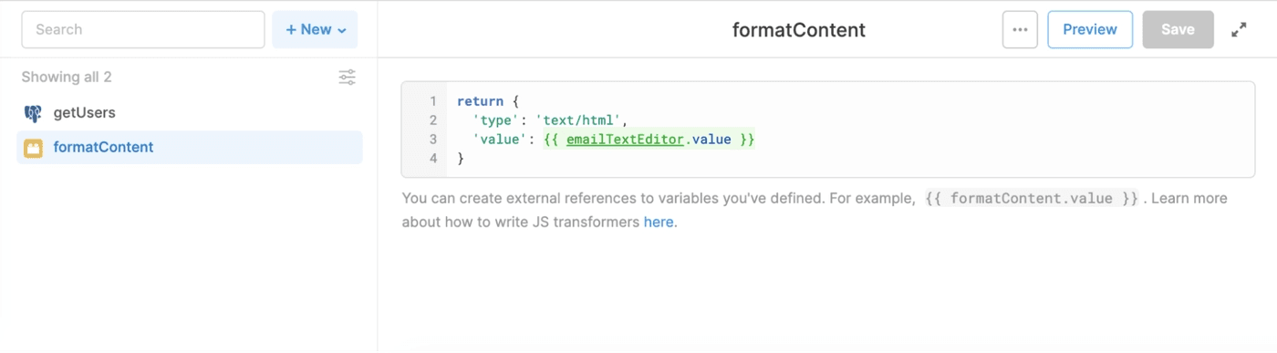 Click “preview” to get a preview of the returned data if you’re curious. Note that we’ll reference the returned value of this transformer in a bit with {{ formatContent.value }}.