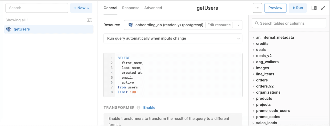 The first thing we’ll want to do is write a query to get our users. We’ve already got a Postgres DB connected, but you can read more about how to do that here. Another thing worth noting – you can swap out Postgres for whatever your system of record is for users (Firebase, MongoDB, etc.).