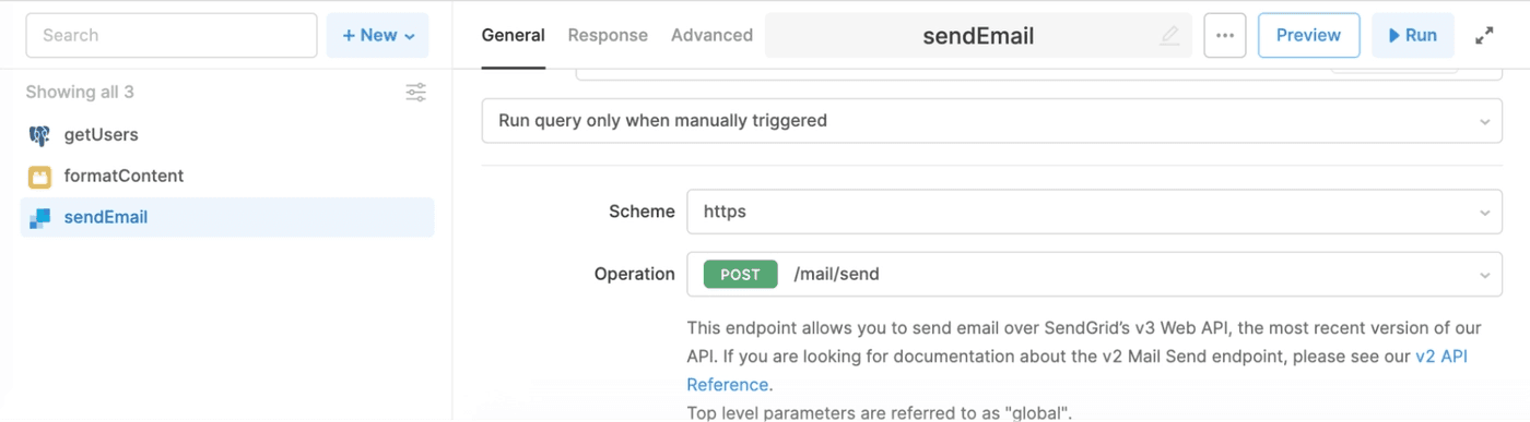 To send an email via the API, we’ll make a POST request to the https://retool.com/mail/send endpoint. Create a new resource query and then select our connected SendGrid resource from the dropdown. Keep “https” as the scheme, and then select the mail send endpoint. We’ll also rename the query sendEmail so we know what we’re working with.