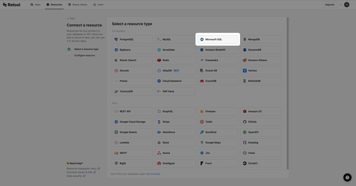 Now, go back to the Connect a resource page in the Retool dashboard. Click Create resource at the bottom to finish creating the SQL resource.