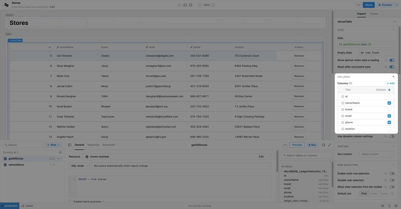 To allow the users to update the store information, make the email, phone, and ownerName columns editable by checking the box next to the column name on the right pane.