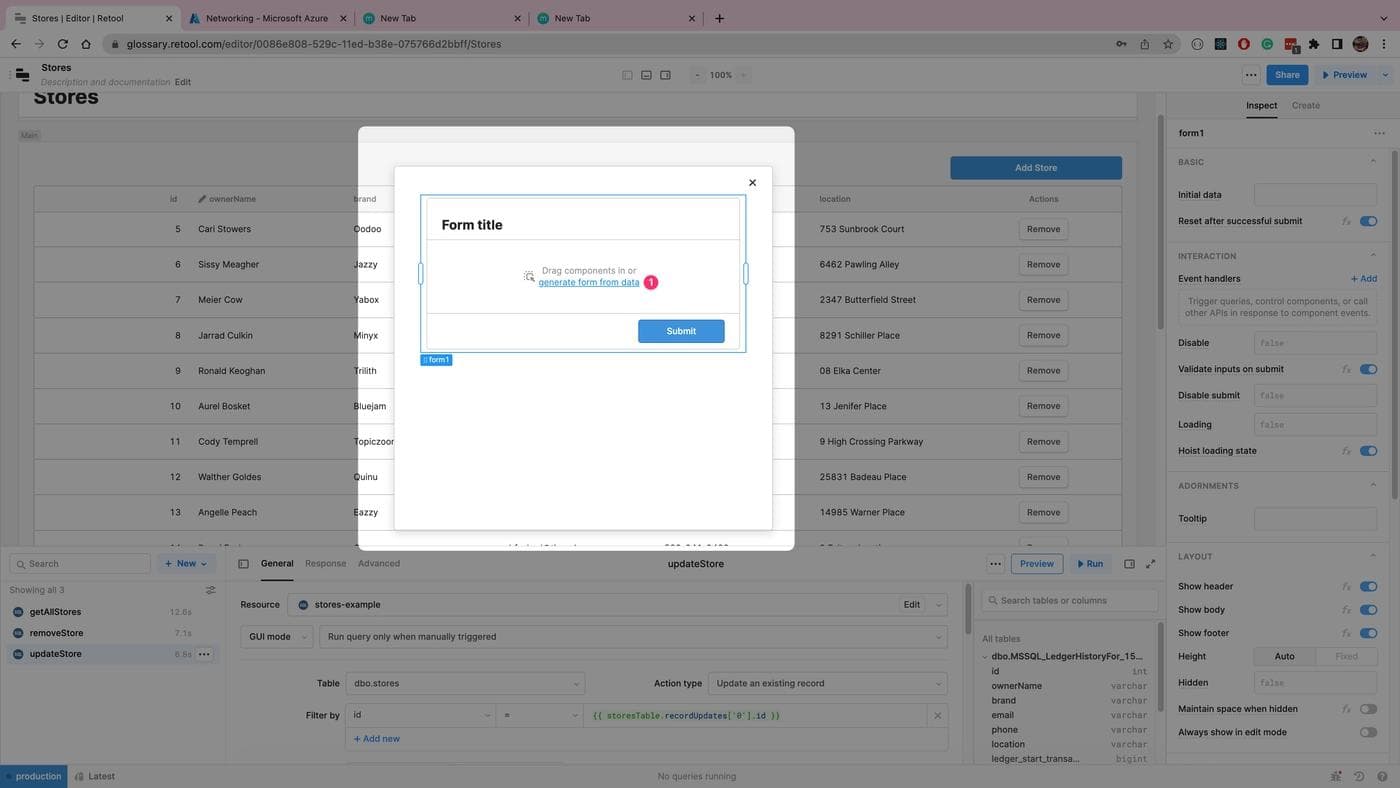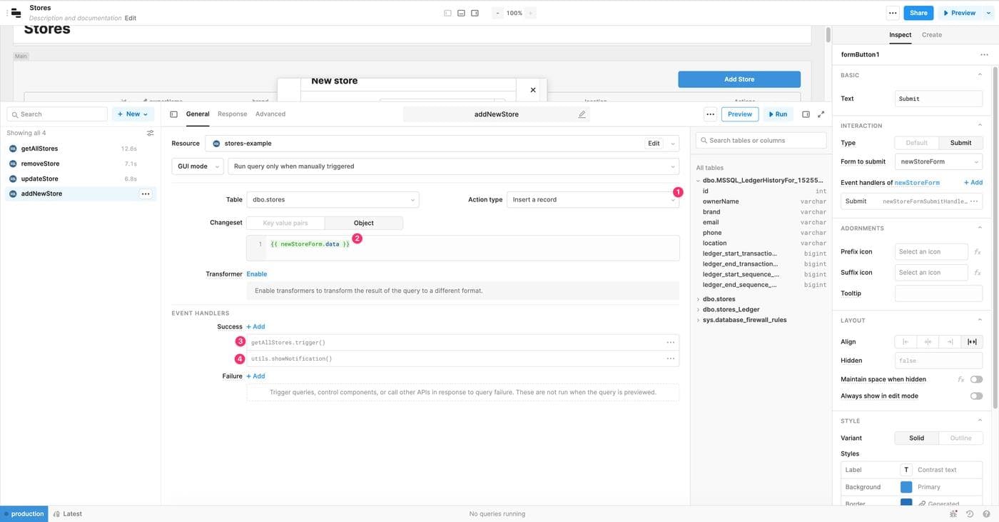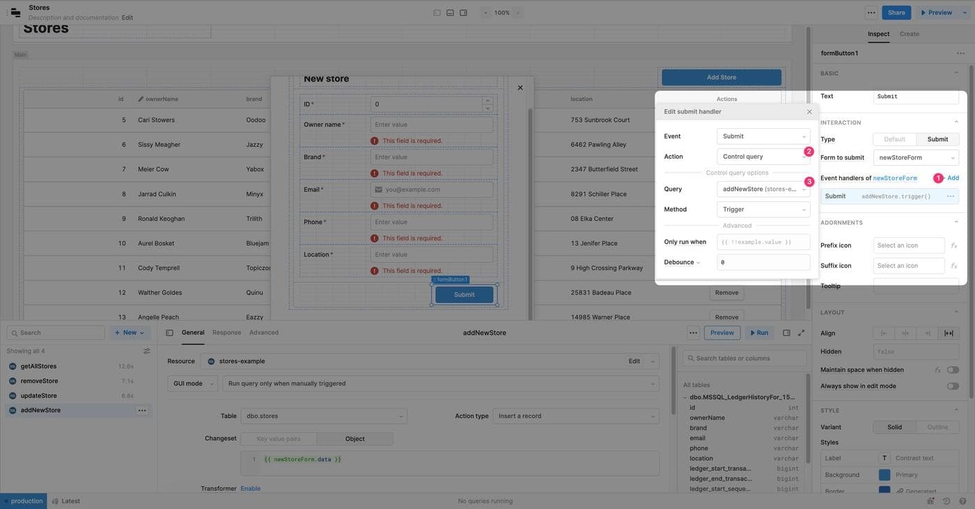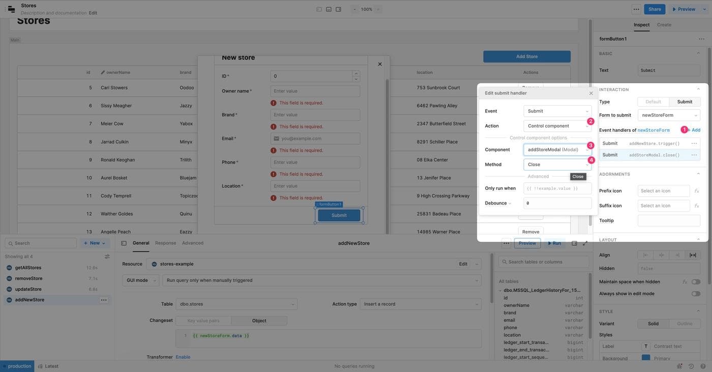 Now select the Submit button of the newStoreForm component in the editor. In the right-pane menu, click Add next to Event handlers of newStoreForm to add a new event handler. This event handler will trigger the addNewStore query and save the form data to the retool-example MS SQL database.