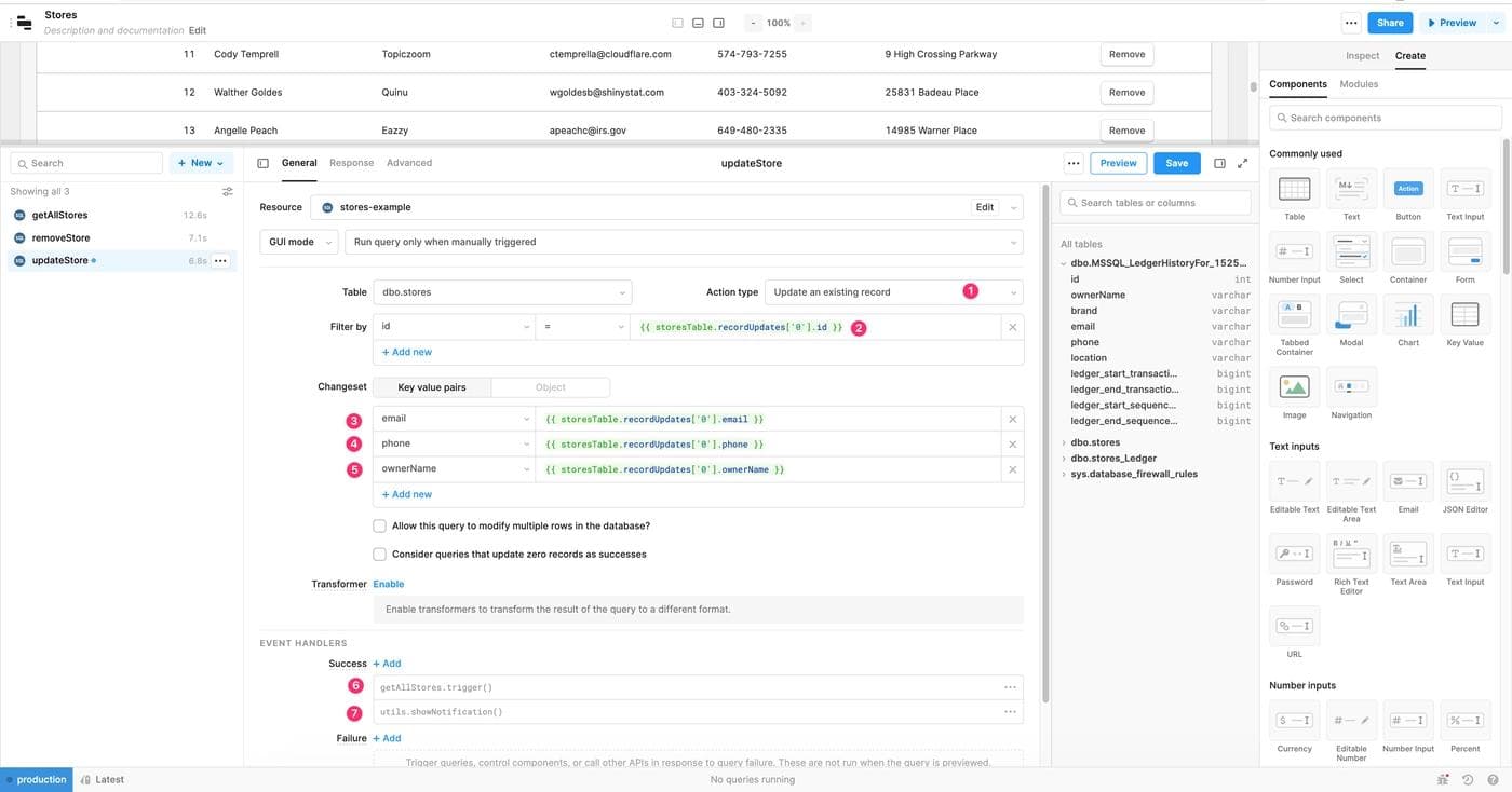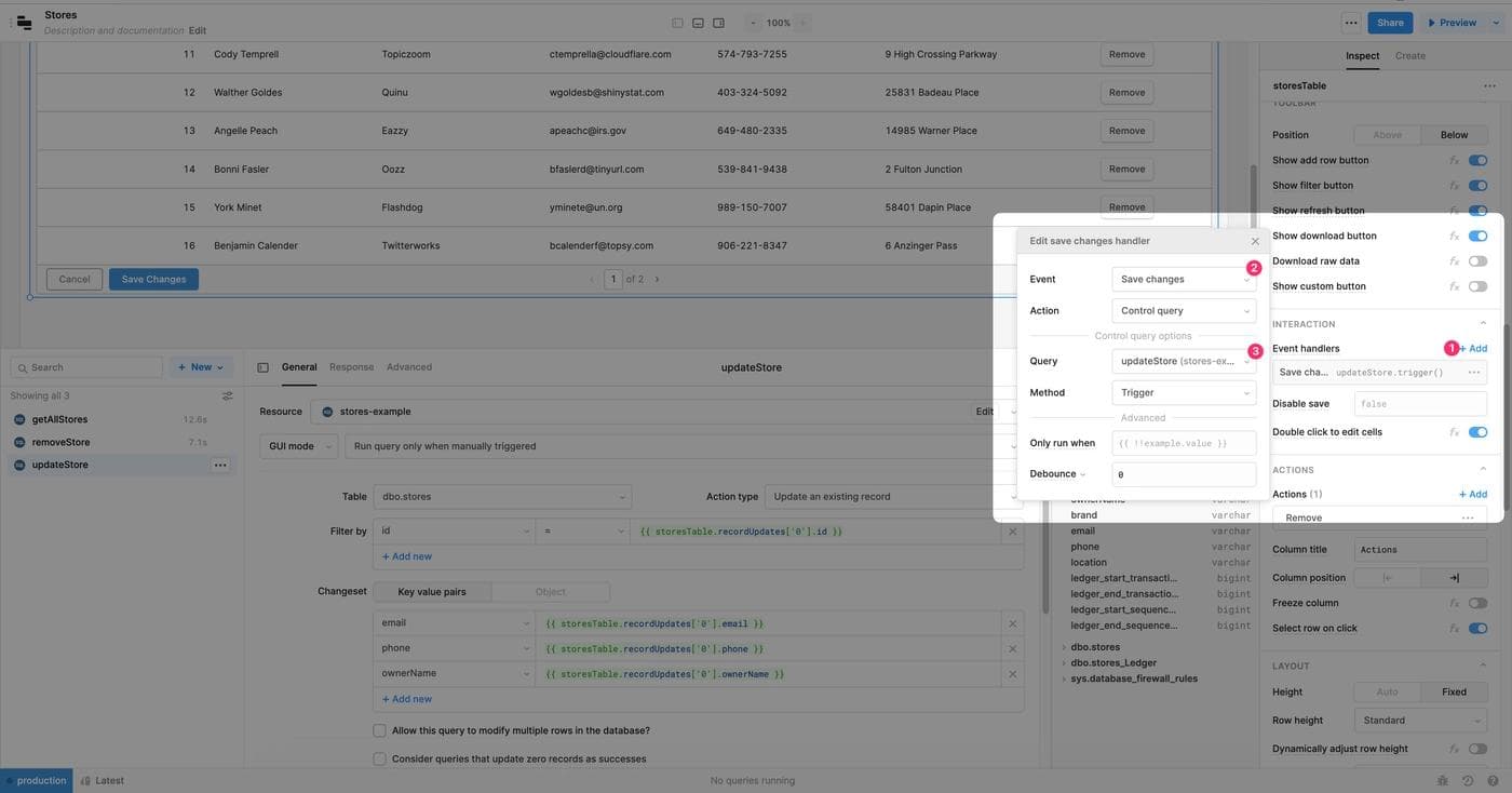 Now select the storesTable component and add a Save changes event handler under the Interaction section on the right pane. Select updateStore in the Query drop-down to trigger it whenever the user clicks Save changes.
