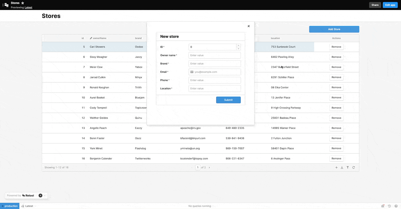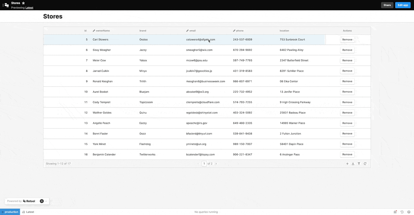 Now that the getAllStores query is ready, drop a Table component from the right pane in the Main section of the application editor. Rename the Table component to storesTable for easy access and specify {{ getAllStores.data }} as the Data field for this component. You'll see that the table automatically shows the data fetched from the stores table of your database.