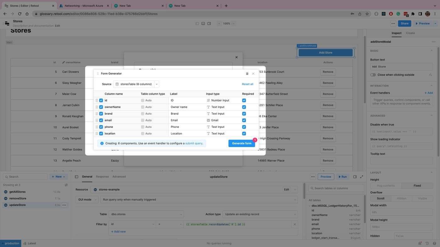 This will open up a form generator and keep all fields selected. Click Generate form. Now rename the form component to newStoreForm and set the form heading text to #### New Store.
