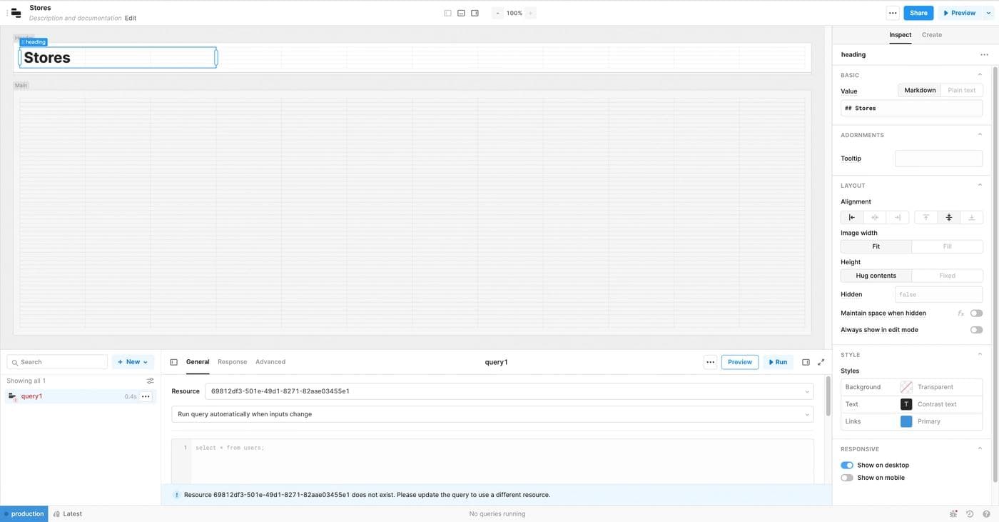 Now that you've configured the database as a resource on your Retool dashboard, you can start creating the user interface using the Retool application editor.