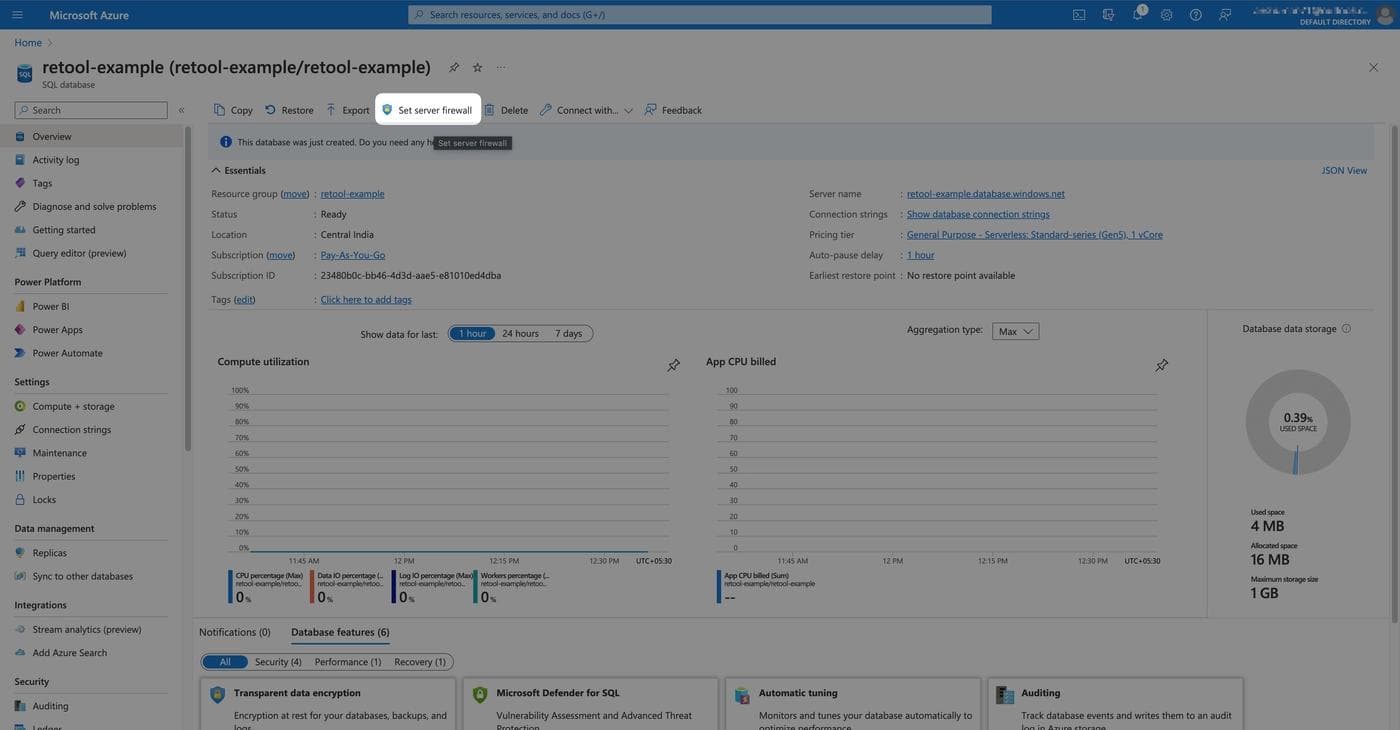 Now go to the retool-example database page on the Azure dashboard and click Set server firewall on the top menu.