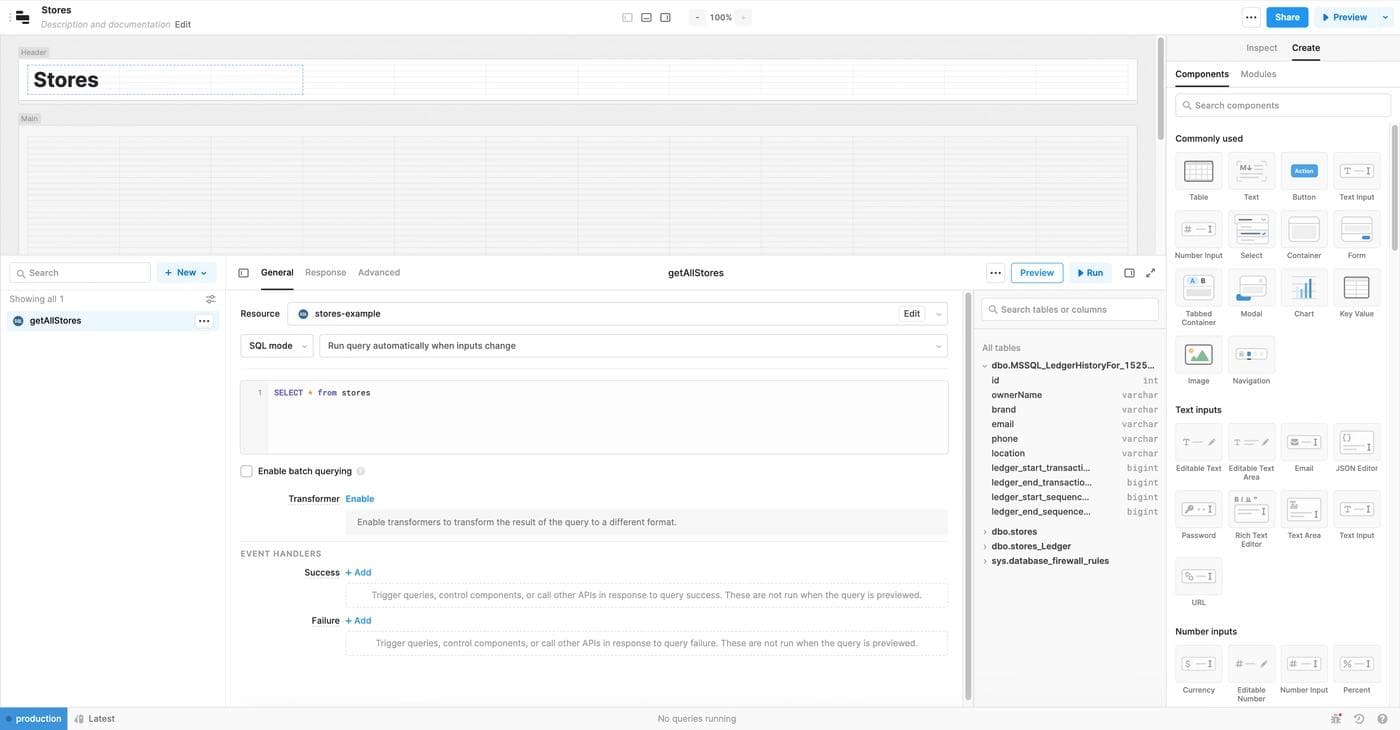 Before showing the stores in a table, you first need to fetch the data from your SQL server database to display a list of all stores in a table. Rename the default query in the bottom section of the application editor as getAllStores. Use the SELECT * from stores SQL query. Click Run to test the query.