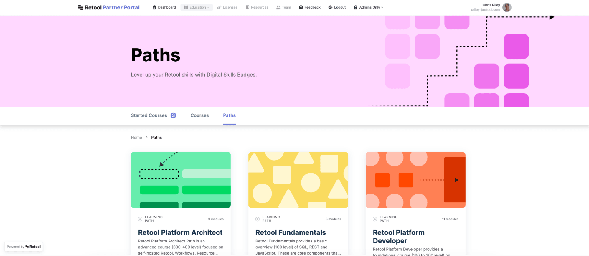 Once we had partners learning in Partner Portal, we validated our hypothesis that we could use Retool as an education platform powered by Workramp, Credly, and our own features like Workflows. The next phase focused on expanding that education experience to anyone building in Retool. Feedback from partners allowed us to hone in on creating more advanced courses, video content, and building best practices.
