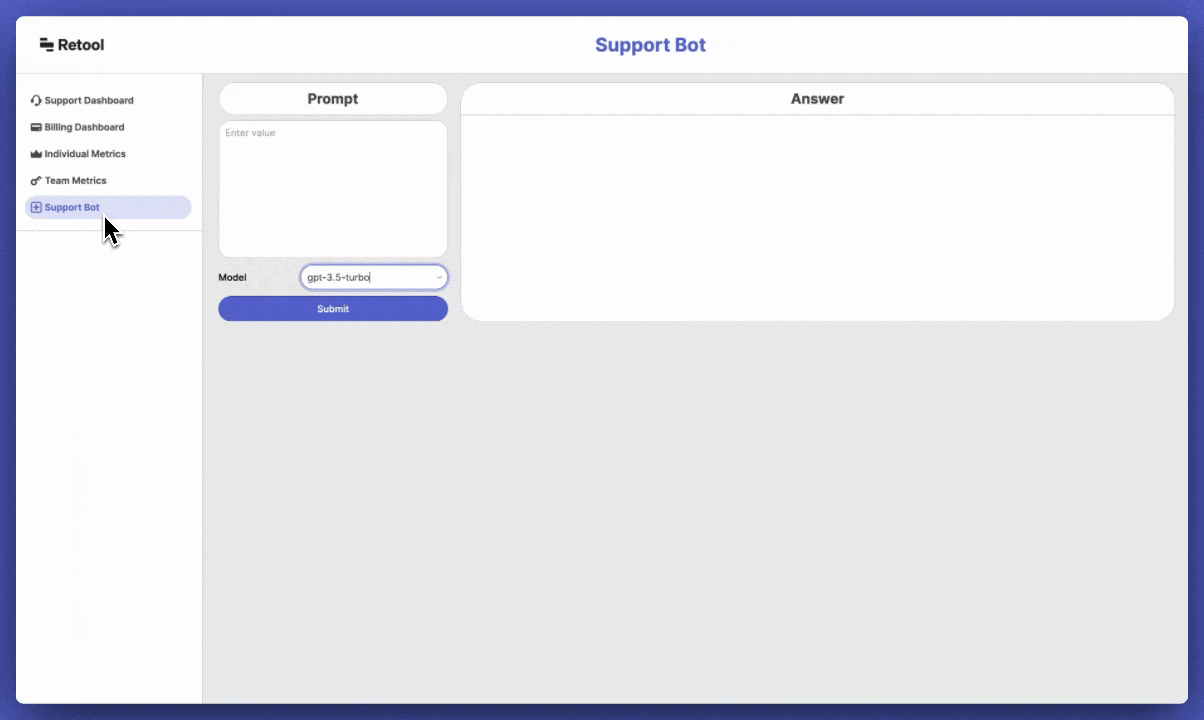 AI-powered enterprise search software is developed by training a machine learning model on the knowledge database. We used GPT-4, a model created by OpenAI, but you can use any appropriate large language model (LLM) that suits your requirements. It’s fairly easy to test and swap out different LLMs with Retool by connecting to their APIs and calling them from your Retool apps, so once you’ve explored specs, data privacy and security considerations, and other relevant attributes, you can experiment as you like to find the most suitable LLM for your specific needs.)