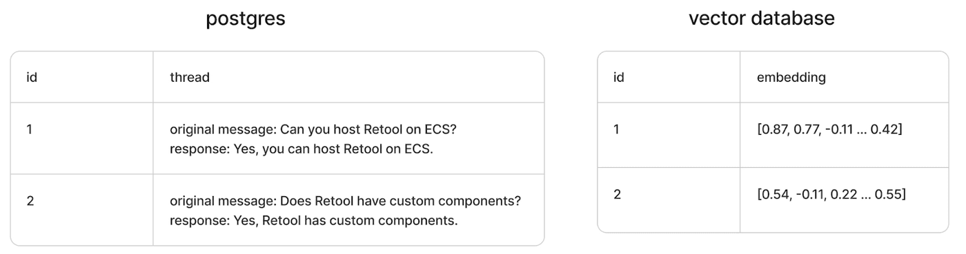 The knowledge database we’re creating has at least two columns: one containing the unstructured text, and another column that stores the vector representation of the corresponding unstructured text. To make searching for and retrieving relevant information efficient, we’ll use a vector similarity search: When a user submits a question, we convert the question to a vector representation, and the search matches the question with the most relevant threads in the database.