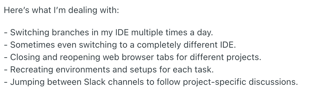 When we talk about context switching in engineering, we tend to focus on the cost of workday interruptions—meetings and Slack notifications that pull a developer out of their flow state. But when you ask a backend engineer to take on frontend tasks, they’re also constantly moving between different languages and parts of the codebase.