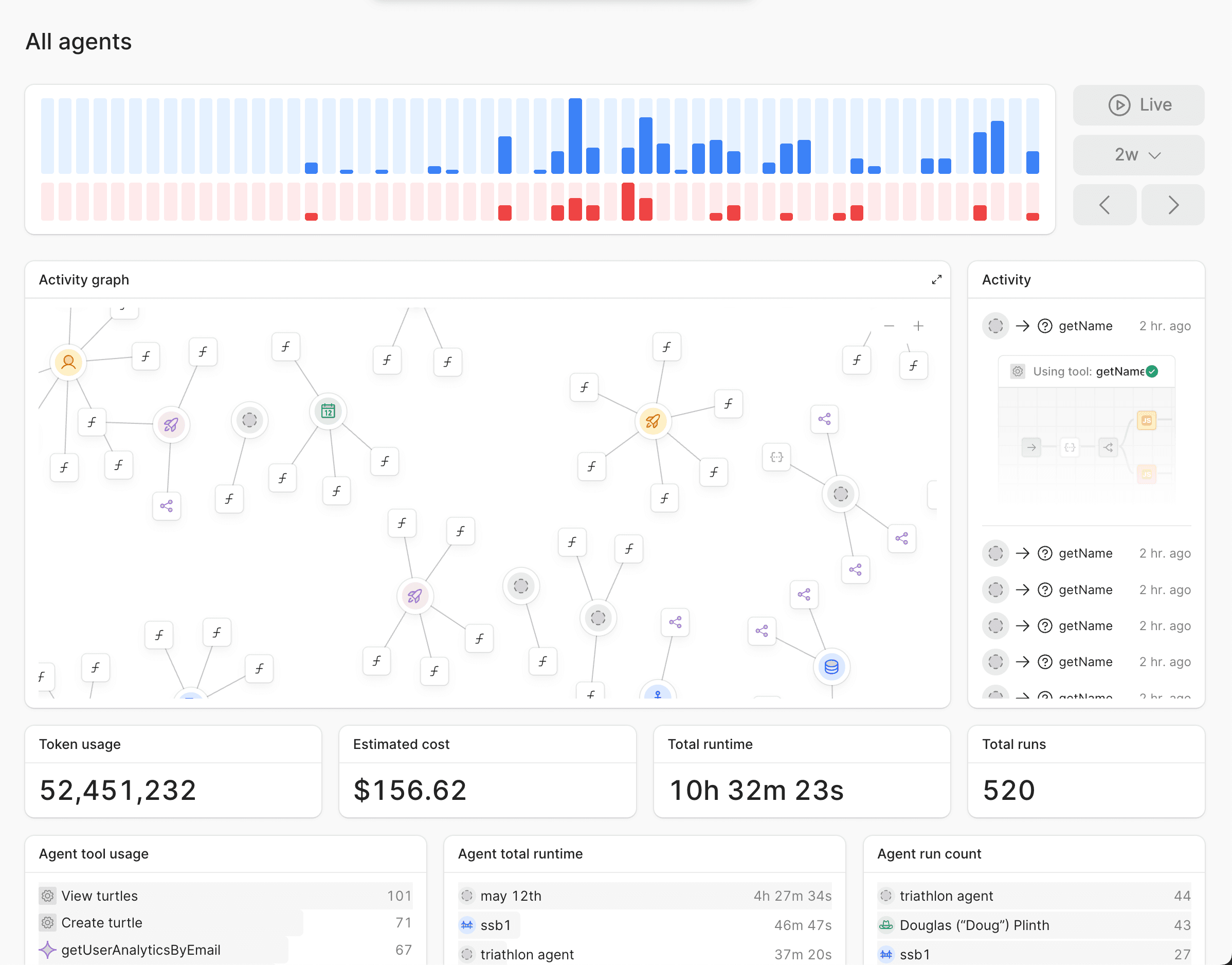 Beyond basic execution metrics, Agents provides visibility into your agent’s operations. You get deep insight into everything your agent does, with transparency beyond simple logs.