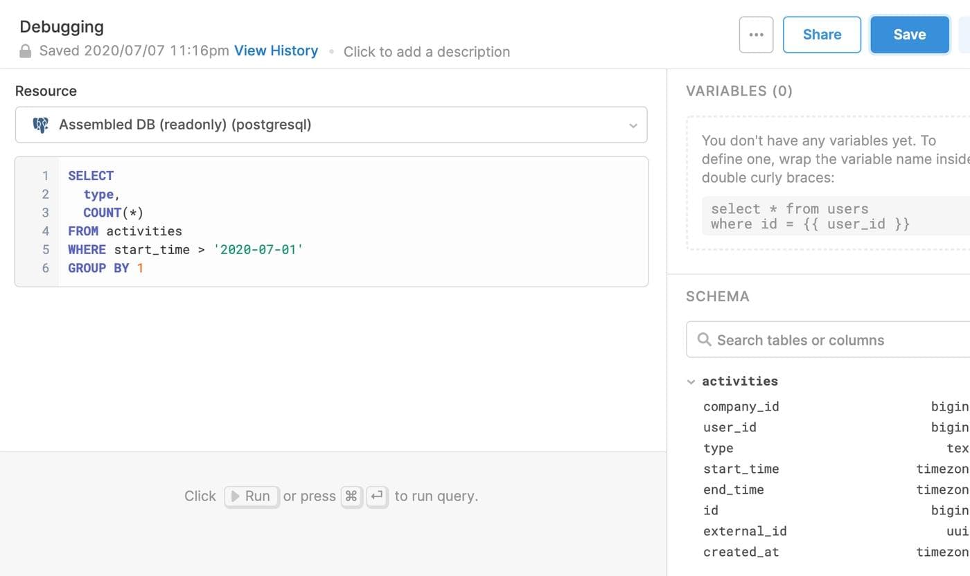 Retool also has a neat feature called the Query Library, which can be used as a nice SQL interface with access to database schemas, or to save and share queries amongst the team. At Assembled we use it extensively, whether it's engineers debugging support issues or business folks building user-facing analyses. Among other things, we consider simple, secure access to be a killer feature in its own right—before Retool, we had to specifically set up SSH access and explain tunneling in order for a Data Scientist on the team to run queries.
