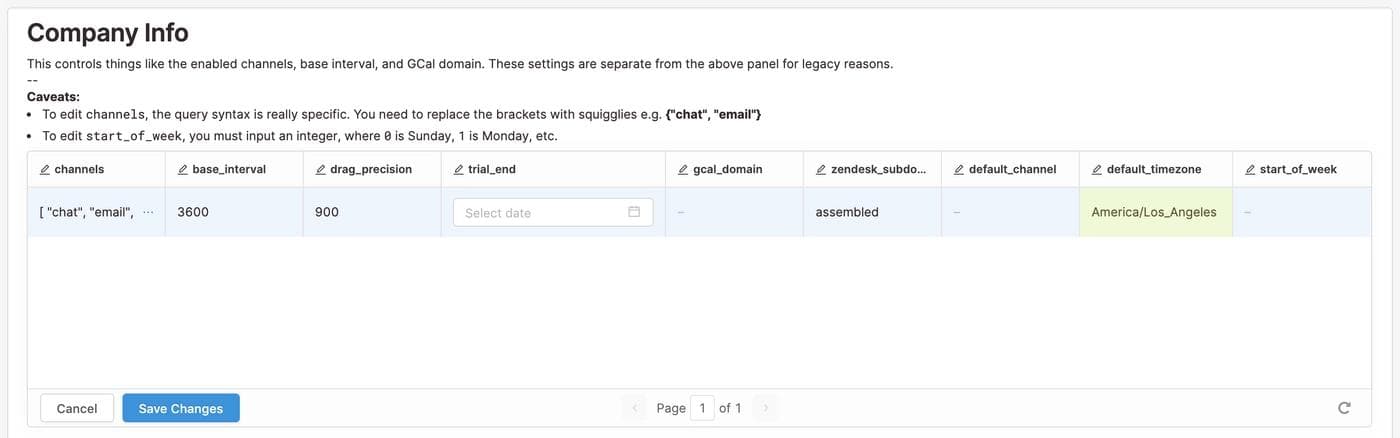 Our most used Retool App is called Edit Company Settings. First, you select a company's account to configure, which is basically a SELECT query over our companies table. Then, you can edit a number of company-wide settings that control how Assembled looks and behaves. Hitting Save Changes fires off an UPDATE query parameterized by the company selection and the fields changed.