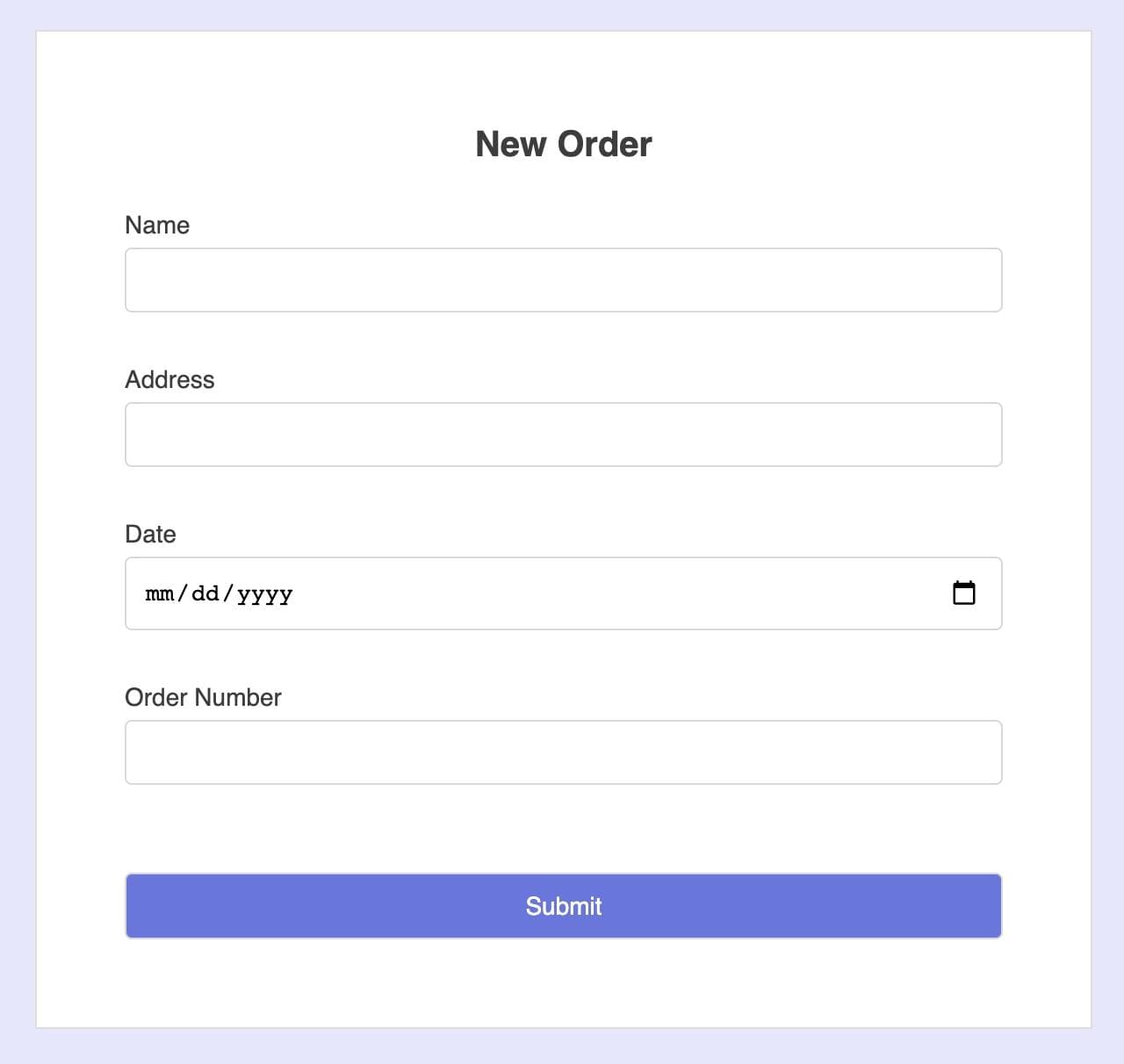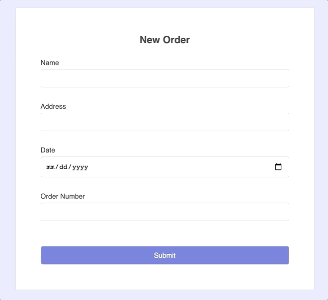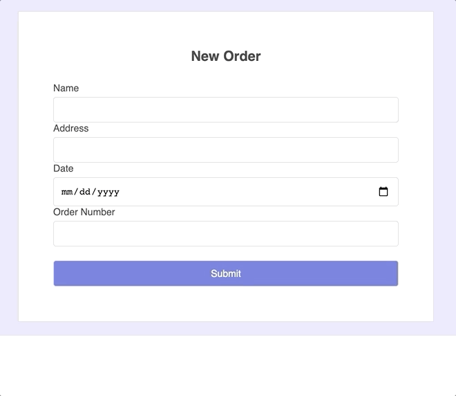 1 2 3 4 5 6 7 8<label>Name</label> <input name="name" ref={register} /> <label>Address</label> <input name="address" ref={register} /> <label>Date</label> <input name="date" ref={register} /> <label>Order Number</label> <input name="order" ref={register} />