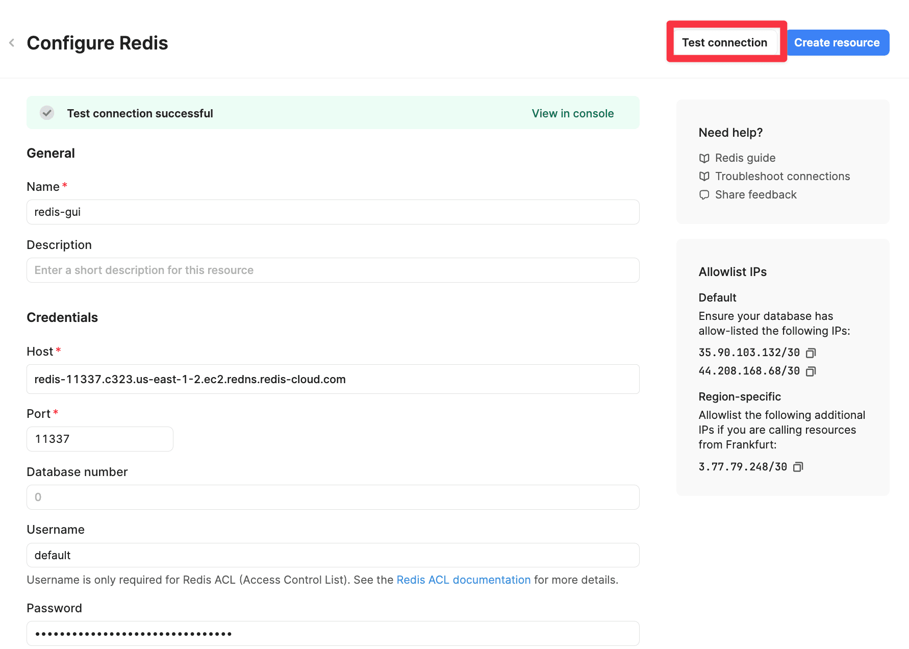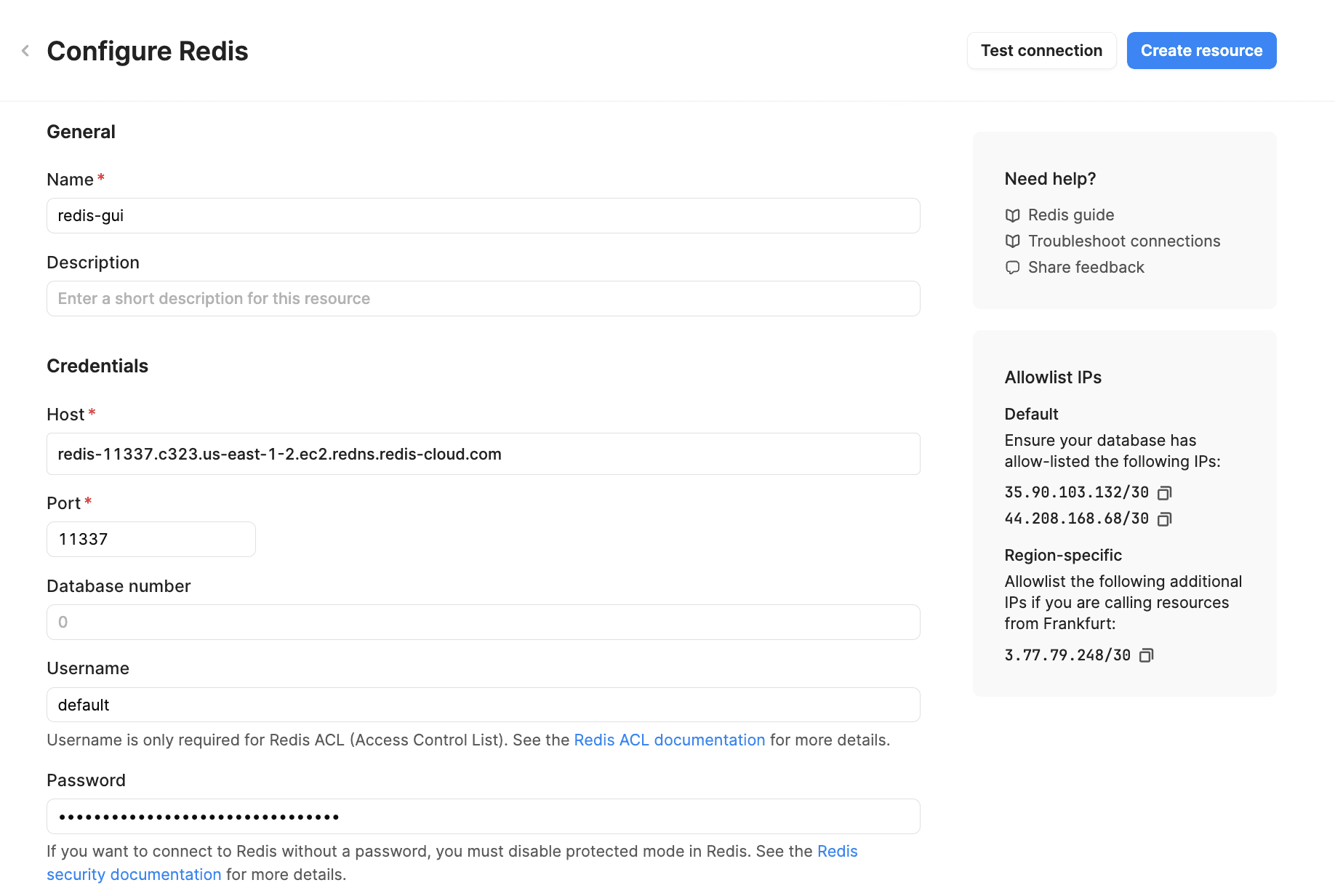 This is where we’re going to need the parameters above. First, name your Redis resource, then add the host, port, username, and password:
