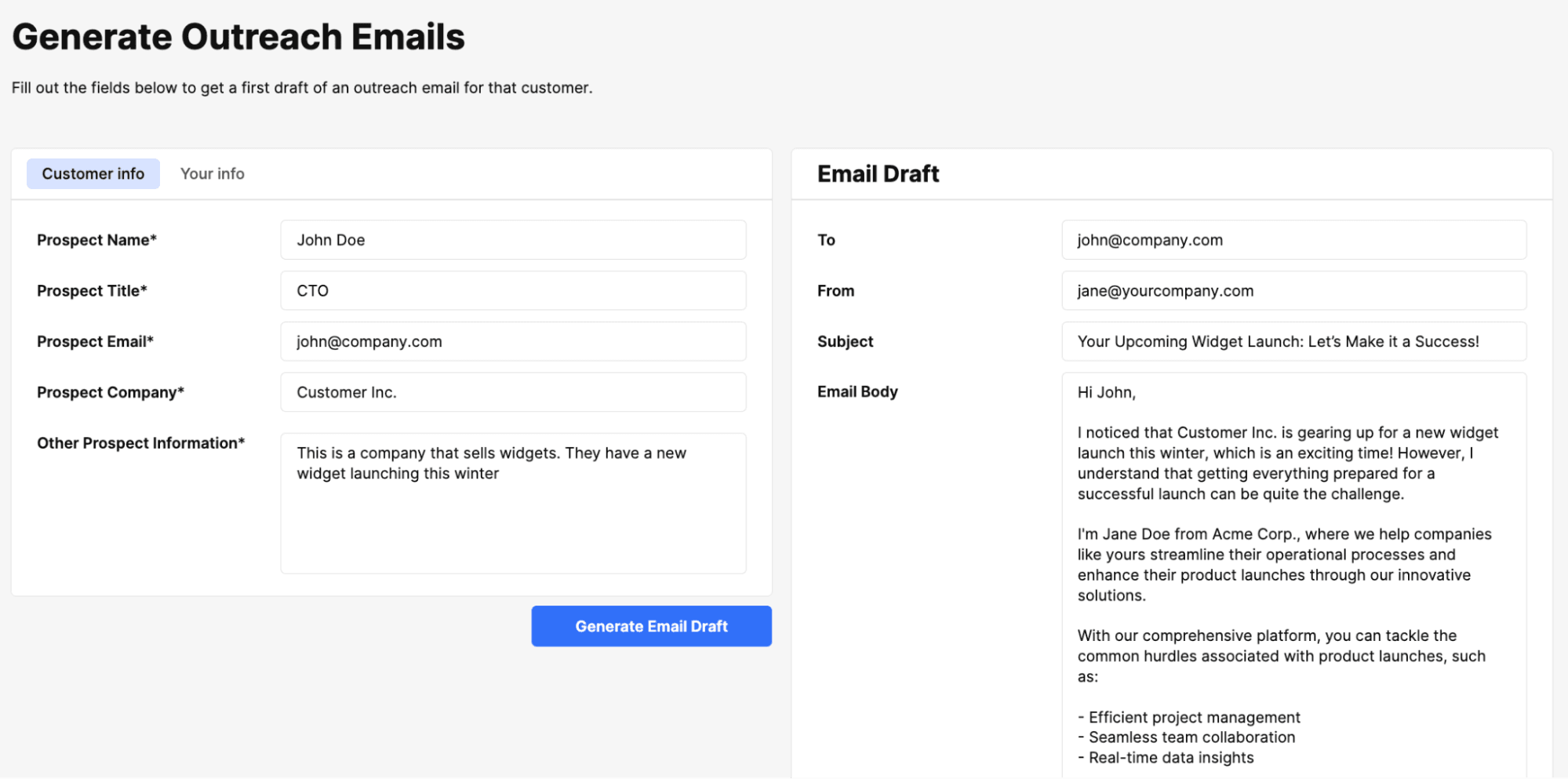 Now, all you have to do is enter different information for each recipient and generate a new outreach email each time. With this app, you can change up the prompt over time, feeding it the successful outreach emails to get a better and better response rate.