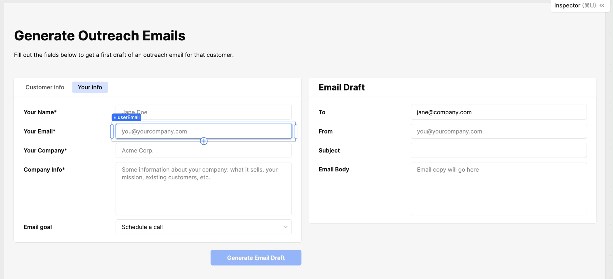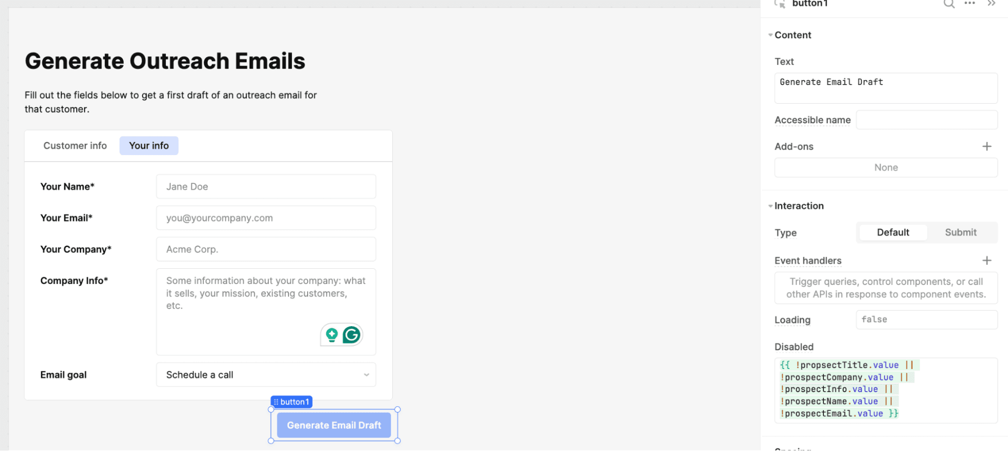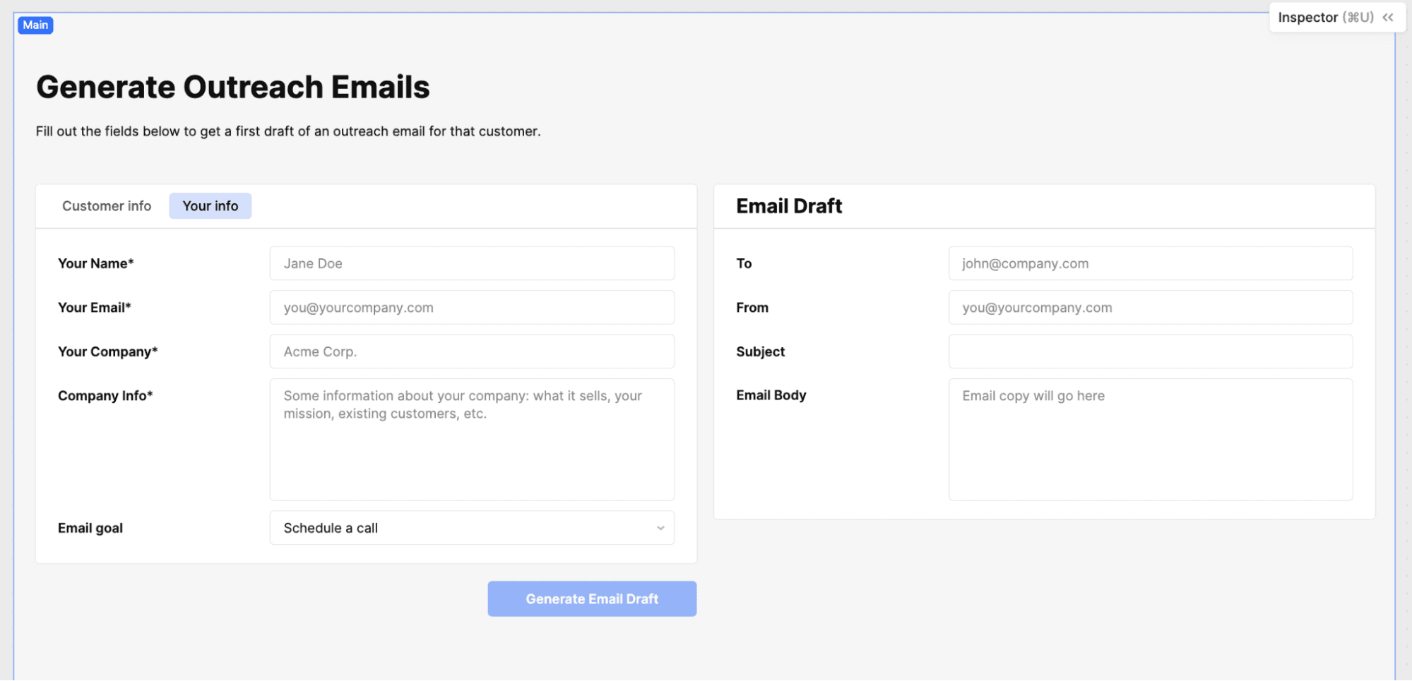 Excellent, now we have a fully-built UI that… does precisely nothing. The next step is to start using these fields to populate a) the email draft and b) our Retool AI prompt.