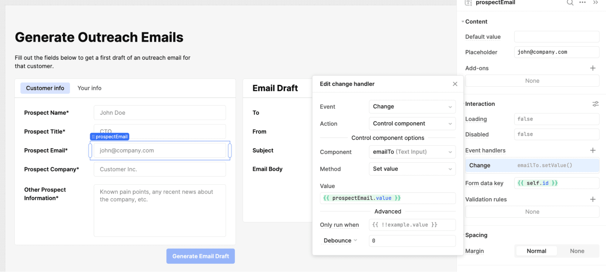 Some fields don’t need to be added to the AI prompt. Instead, they can be copied over directly into our email drafts, such as the customer’s and user’s email addresses. To do that, we can use Retool event handlers.