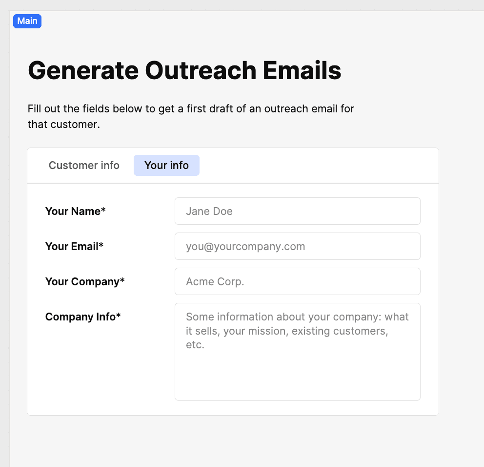 In this case, we want the customer’s name, title, email, company, and any other information about the customer that would help write the outreach email. We create input text fields for each of these, which will act as the values for the parameters in our prompt.