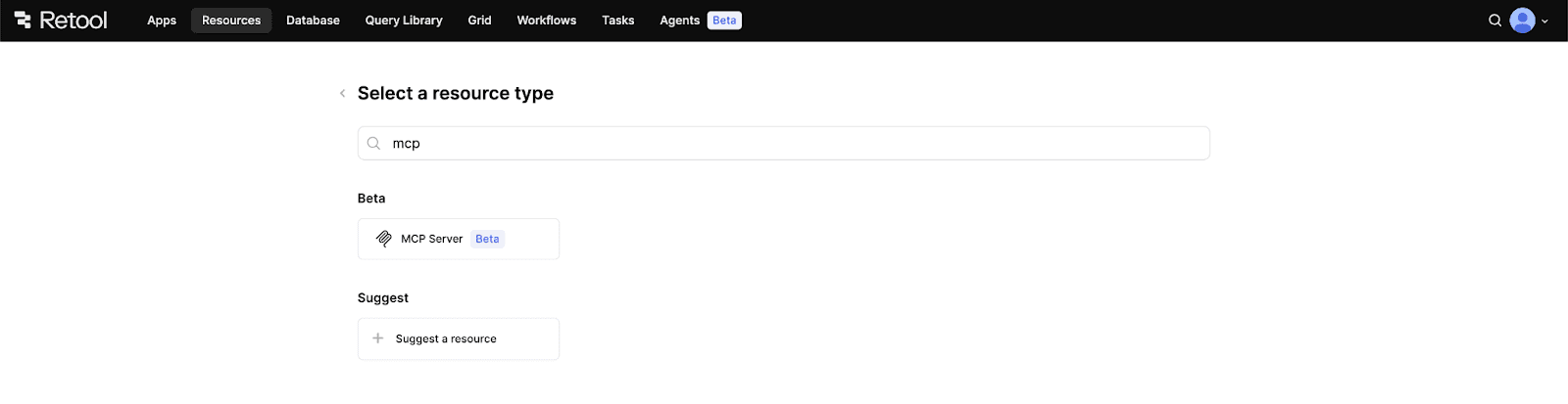 From within your Retool account, click on the Resources tab and click Create new → Resource. Then select MCP Server as your resource type.