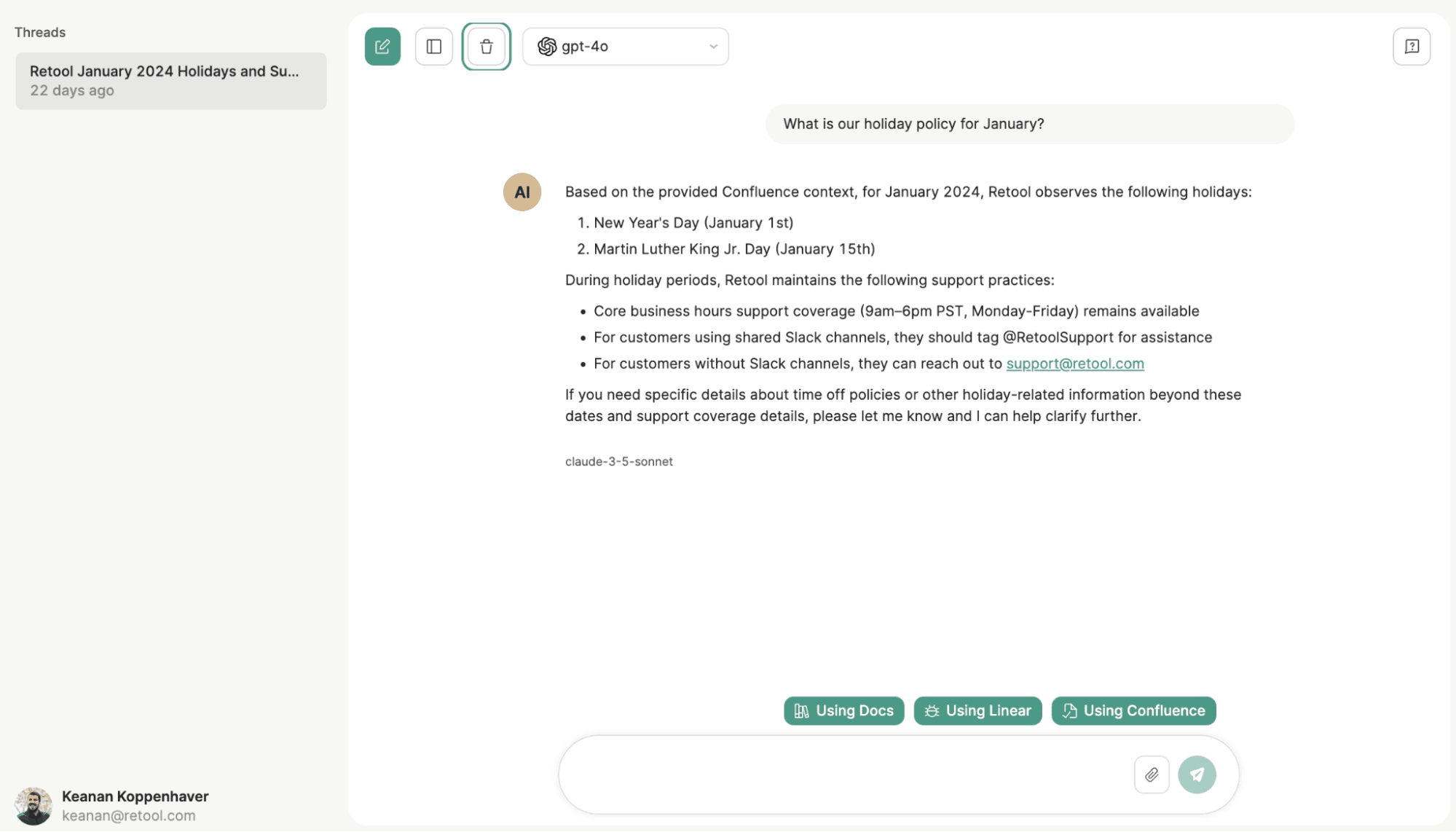 RetoolGPT is an internal version of ChatGPT that has access to our Confluence documents, Retool documentation, and Linear tickets as data sources. This means we can easily switch between chat models if one isn’t working as expected, and RetoolGPT can use internal company data to provide better, more specific answers to users’ questions.